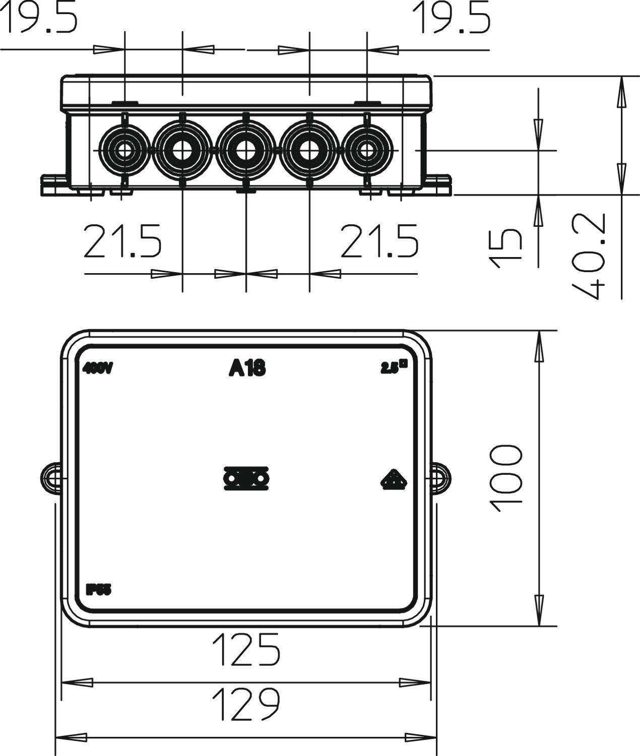 Clear internal dimensions 115x90x35 mm CO2 Footprint (GWP) Cradle-to-Gate 0,2099 kg CO2e / 1 Piece Colour Light grey; RAL 7035 Cover Not transparent Cover fastening Locking Dimension 125x100x38 Entry from rear no Equipment Without Expandable yes Explosion-tested version no Flame-resistant acc. to VDE 0471/DIN 695 Part 2-1, test temperature 650°C For Ex zone Without For Ex zone dust Without For Ex zone gas Without Halogen-free yes Height 40 mm Junction box cover version Blanking lid Length 125 mm Maintain electrical functions Without Material Polyethylene Max. Conductor cross-section 2,5 mm² Measured insulation voltage Vi 690 V Mounting type Wall/ceiling mounting No. of entries 18 Nominal cross-section, min. 2,5 mm² Nominal voltage 690 V Permitted temperature range, max. 45 °C Permitted temperature range, min. -5 °C Protection rating IP55 Sealable no Shape Square Transparent lid no Type of entry Cable Type of entry Cable Type of housing penetration Pre-marking Weatherproof no Width 100 mm with lid yes With screening no - All types
