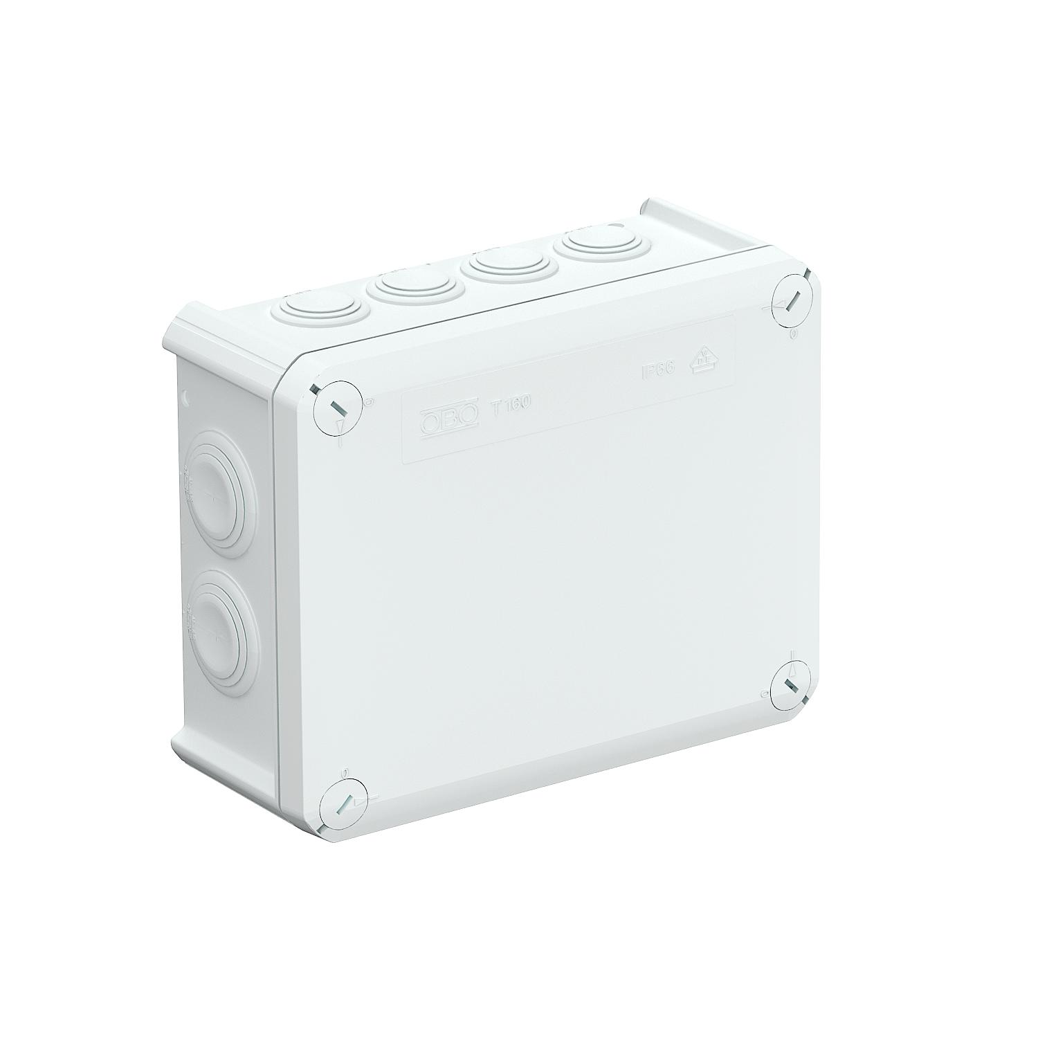 Product descriptionJunction box for the connection of cables and lines indoors and in protected outdoor areas. Rectangular design with plug-in seals to the sides and knock-out entries in the bottom. Suitable for wall and ceiling mounting and on mounting panels. With the option to fasten inside and to mount via the corner domes. Cover with quick lock, sealable. Made from halogen-free and UV-resistant materials.