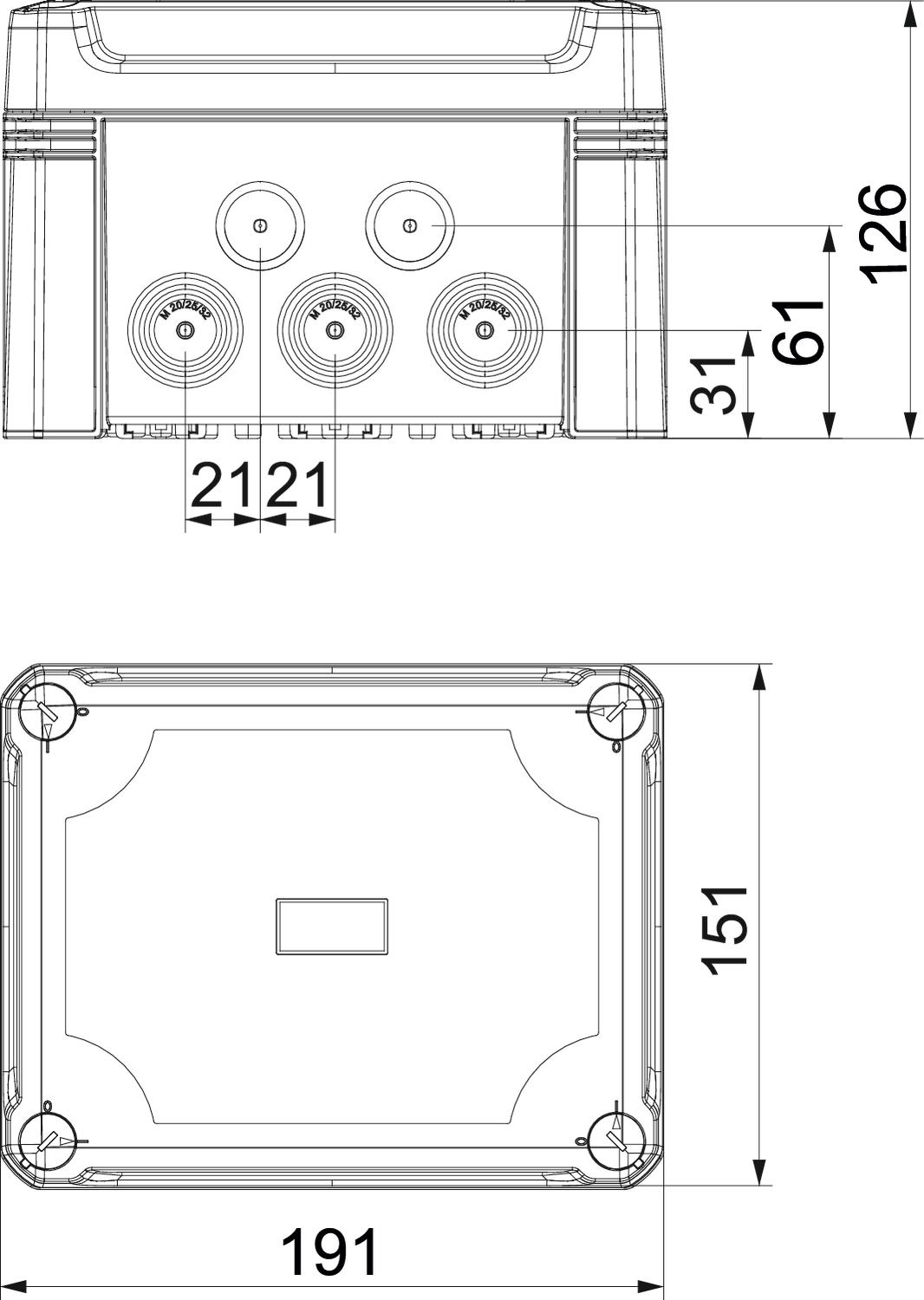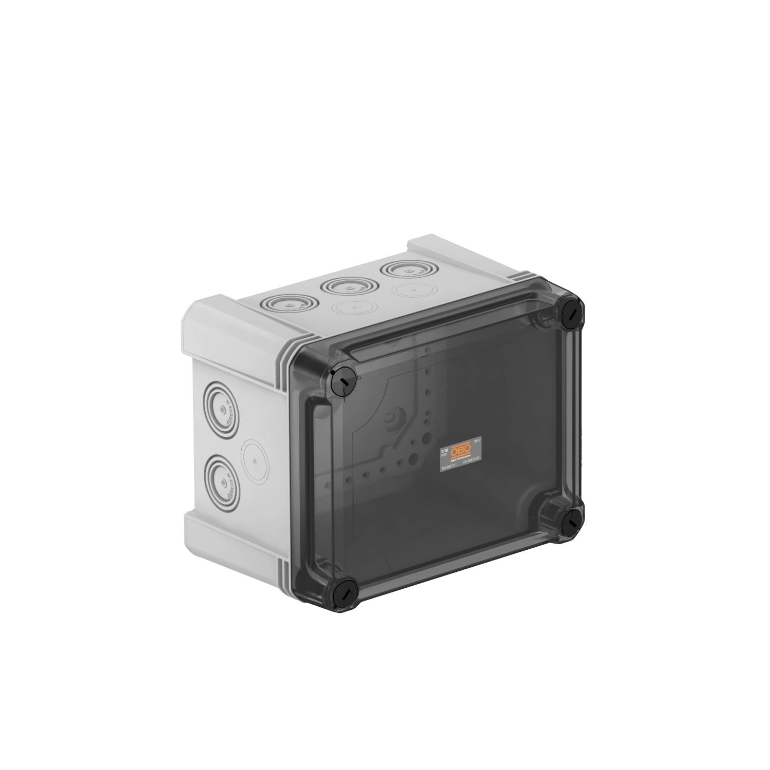 Clear internal dimensions 177x137x110 mm CO2 Footprint (GWP) Cradle-to-Gate 2,2049 kg CO2e / 1 Piece Colour Grey / transparent Cover Not transparent Cover fastening Screwed Dimension 190x150x125 Entry from rear no Equipment Without Expandable yes Explosion-tested version no Fibre-glass reinforced yes Flame-resistant acc. to VDE 0471/DIN 695 Part 2-1, test temperature 650°C Halogen-free yes Height 126 mm Impact-resistant yes Length 191 mm Material Polycarbonate Max. Conductor cross-section 10 mm² Measured insulation voltage Vi 750 V Mounting type Wall/ceiling mounting No. of entries 10 Nominal cross-section, max. 10 mm² Nominal cross-section, min. 4 mm² Nominal voltage 750 V Permitted temperature range, max. 60 °C Permitted temperature range, min. -5 °C Protection rating IP67 Protection rating IK code IK09 Sealable yes Shape Rectangular Transparent lid yes Type of entry Cuttable stepped membrane Type of housing penetration Pre-marking Weatherproof yes Width 151 mm with lid yes With screening no - All types