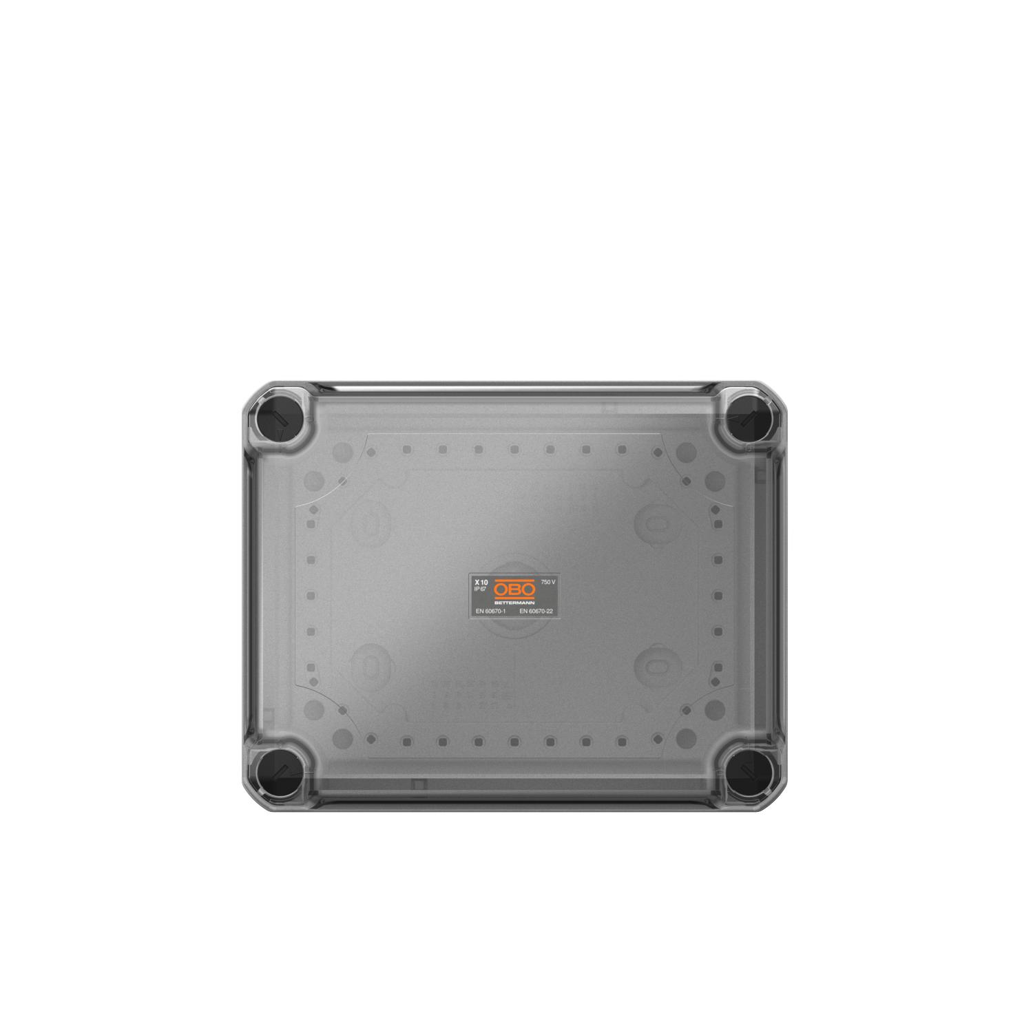 Product descriptionJunction box for the connection of cables and lines indoors and in outdoor areas. Rectangular design with knock-out entries. Suitable for wall and ceiling mounting with the option to fasten outside, inside or to mount via the corner domes. Particularly impact resistant with IK09. Transparent cover with quick lock, sealable. Made from halogen-free and UV-resistant materials.