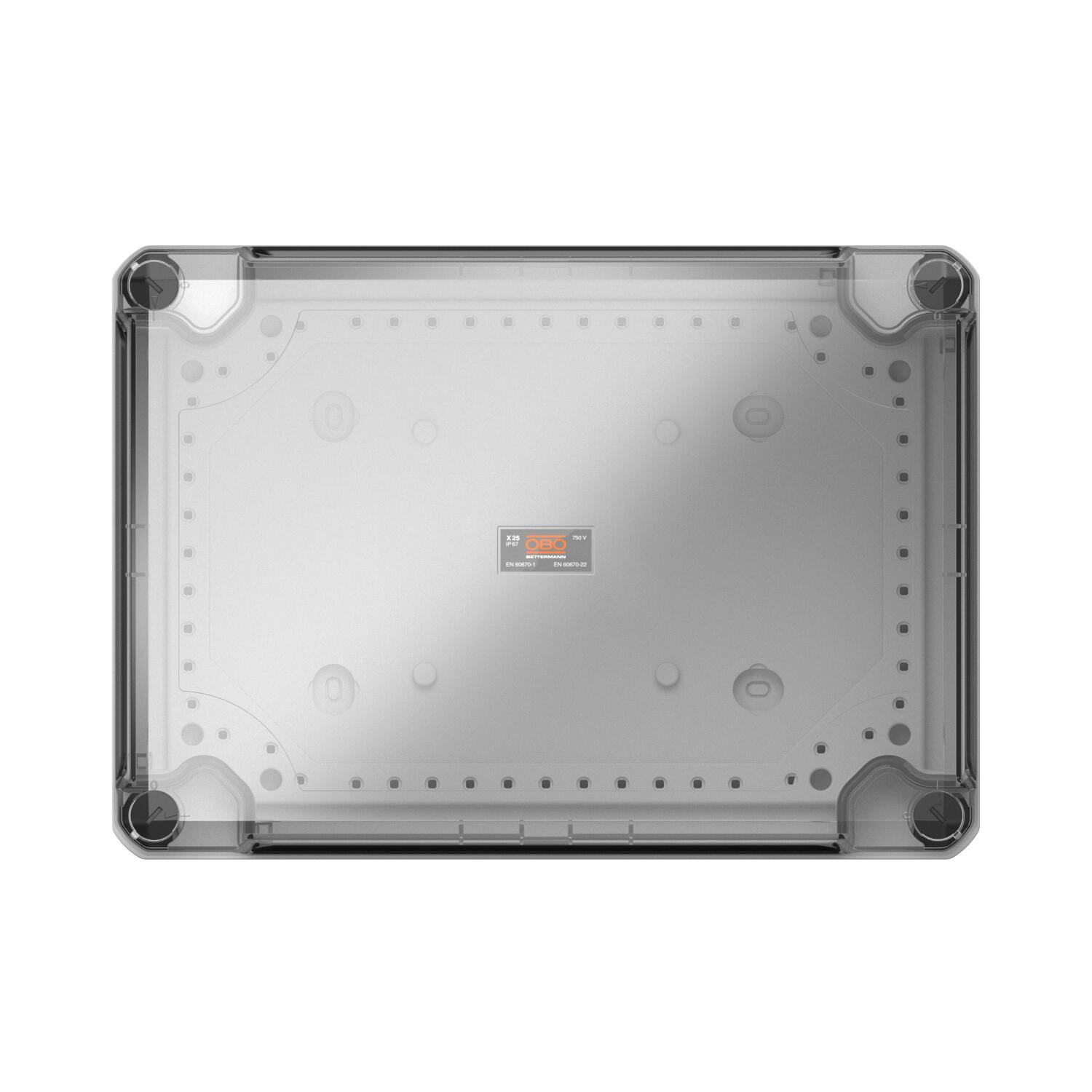 Product descriptionJunction box for the connection of cables and lines indoors and in outdoor areas. Rectangular design with knock-out entries. Suitable for wall and ceiling mounting with the option to fasten outside, inside or to mount via the corner domes. Particularly impact resistant with IK08. Transparent cover with quick lock, sealable. Made from halogen-free and UV-resistant materials.