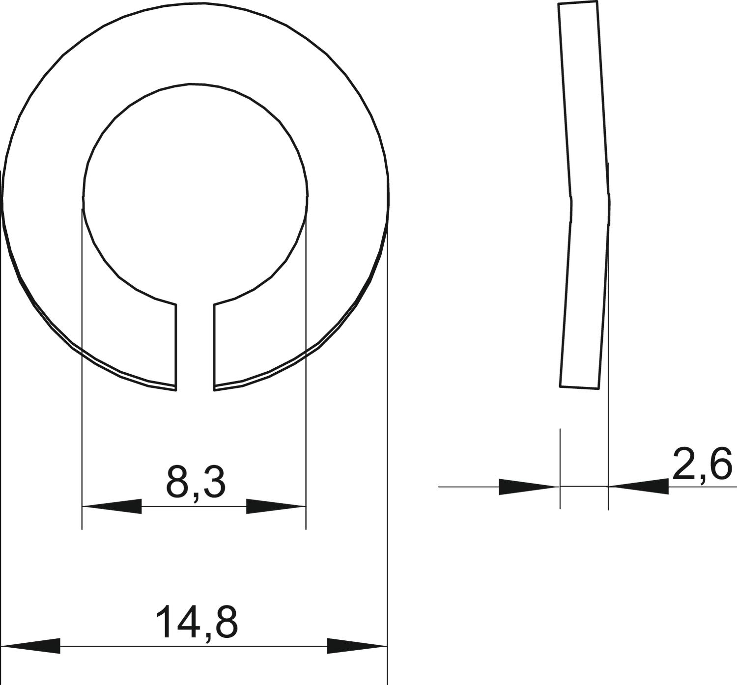 CO2 Footprint (GWP) Cradle-to-Gate 0,0066 kg CO2e / 1 Piece Dimension M8 Dimension d 8,3 mm Dimension d max. 14,8 mm Dimension d min. 14,8 mm Dimension h 2,6 mm External diameter 14,8 mm Height 2,6 mm Lock washer version Ribbed Material Stainless steel Surface Bright, treated Thickness 2,6 mm Thread M8 - All types