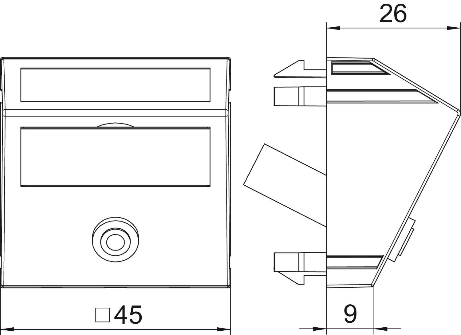 CO2 Footprint (GWP) Cradle-to-Gate 0,2377 kg CO2e / 1 Piece Colour Black-grey; RAL 7021 Combination Basic element with central cover plate Depth 26 mm Dimension 45x45mm Fastening type Lock Halogen-free yes Height 45 mm Hinged cover no Labelling panel With labelling panel Lamp-wire connector no Material Polycarbonate Number of units 1 Outlet direction Sloping Protection rating IP20 Strain relief option no Support ring no Surface version Matt Transparent no Use Cinch Width 45 mm With dust protection no With printed label no - All types