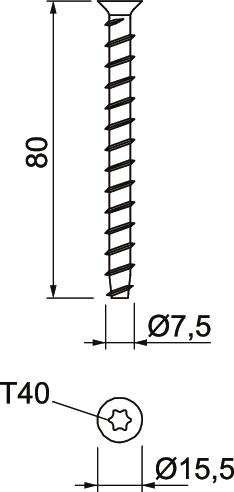 Anchor length 80 mm Anchor/nail/bolt version Spiral anchor Colour zinc Dimension 7,5x80 Dimension 7,5x80 Dimension L 80 mm Drill hole diameter, min. 6 mm Head diameter 15,5 mm Head shape Countersunk head Length 80 mm Material Steel Screw system Torx Surface galvanised Thread diameter ST 7,5 - All types