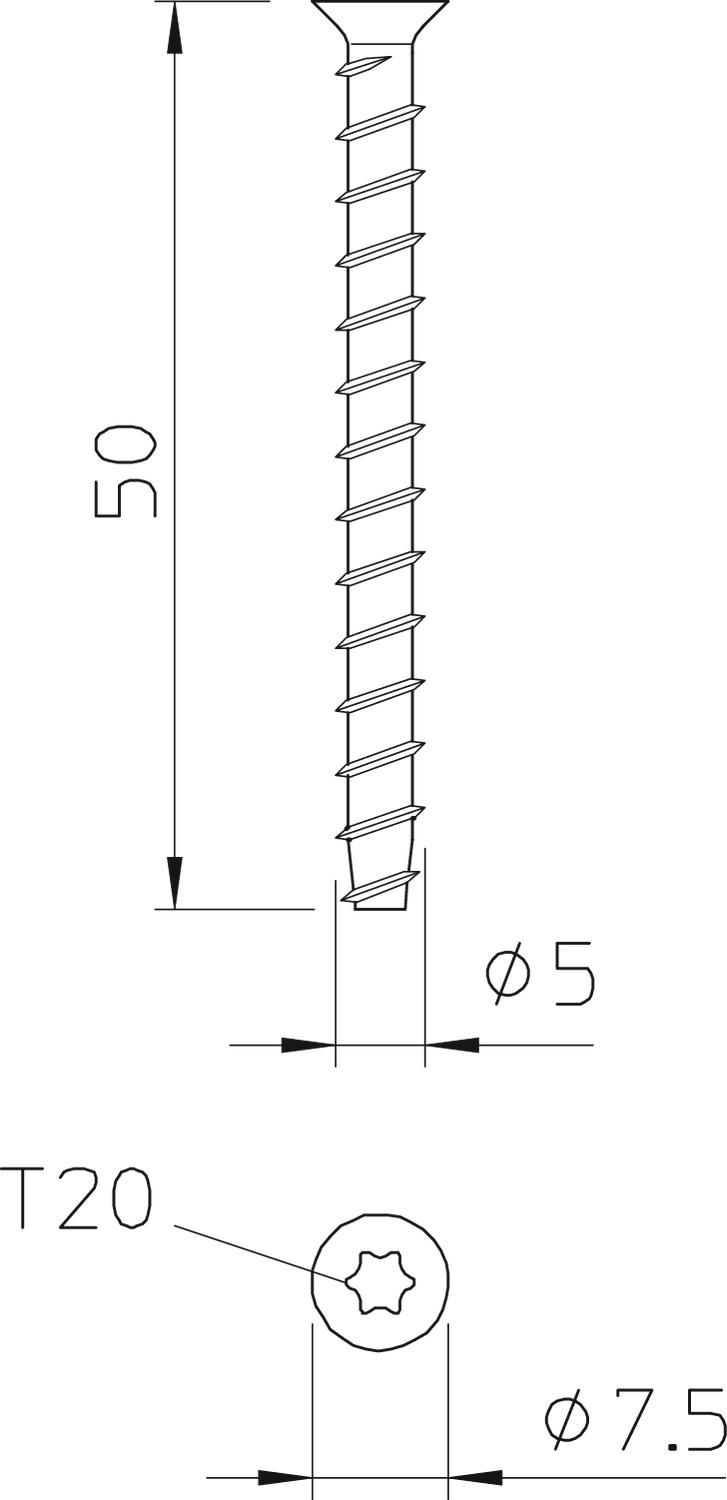 Anchor length 50 mm Colour zinc Dimension 5x50mm Dimension 5 x 50 Dimension L 50 mm Drill hole diameter, min. 4 mm Head diameter 7,5 mm Head shape Countersunk head Length 50 mm Material Steel Screw system Torx Surface Electrogalvanized Thread diameter ST 5 - All types