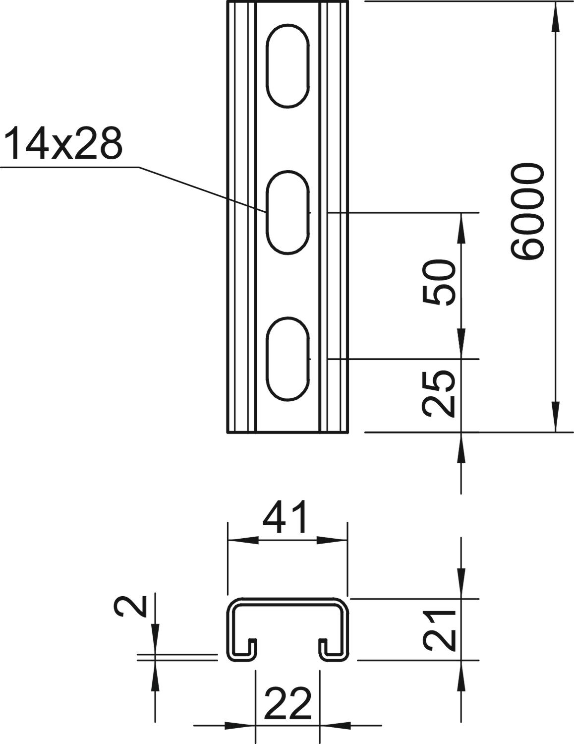 Breakable no CO2 Footprint (GWP) Cradle-to-Gate 3,457 kg CO2e / 1 Meter Dimension 6000x41x21 Dimension L 6000 mm Drill hole spacing, centre 50 mm Height 21 mm Hole size 14x28 mm Length 6000 mm Maintain electrical functions yes Material Steel Material thickness 2 mm Profile shape C profile Slot width 22 mm Static value A 1,65 cm² Static value ly 0,95 cm⁴ Static value lz 4,51 cm⁴ Static value Wy 0,89 cm³ Static value Wz 2,2 cm³ Surface Strip galvanized Type of perforation Perforated back Version for Single profile Width 41 mm With perforation yes With toothing yes - All types