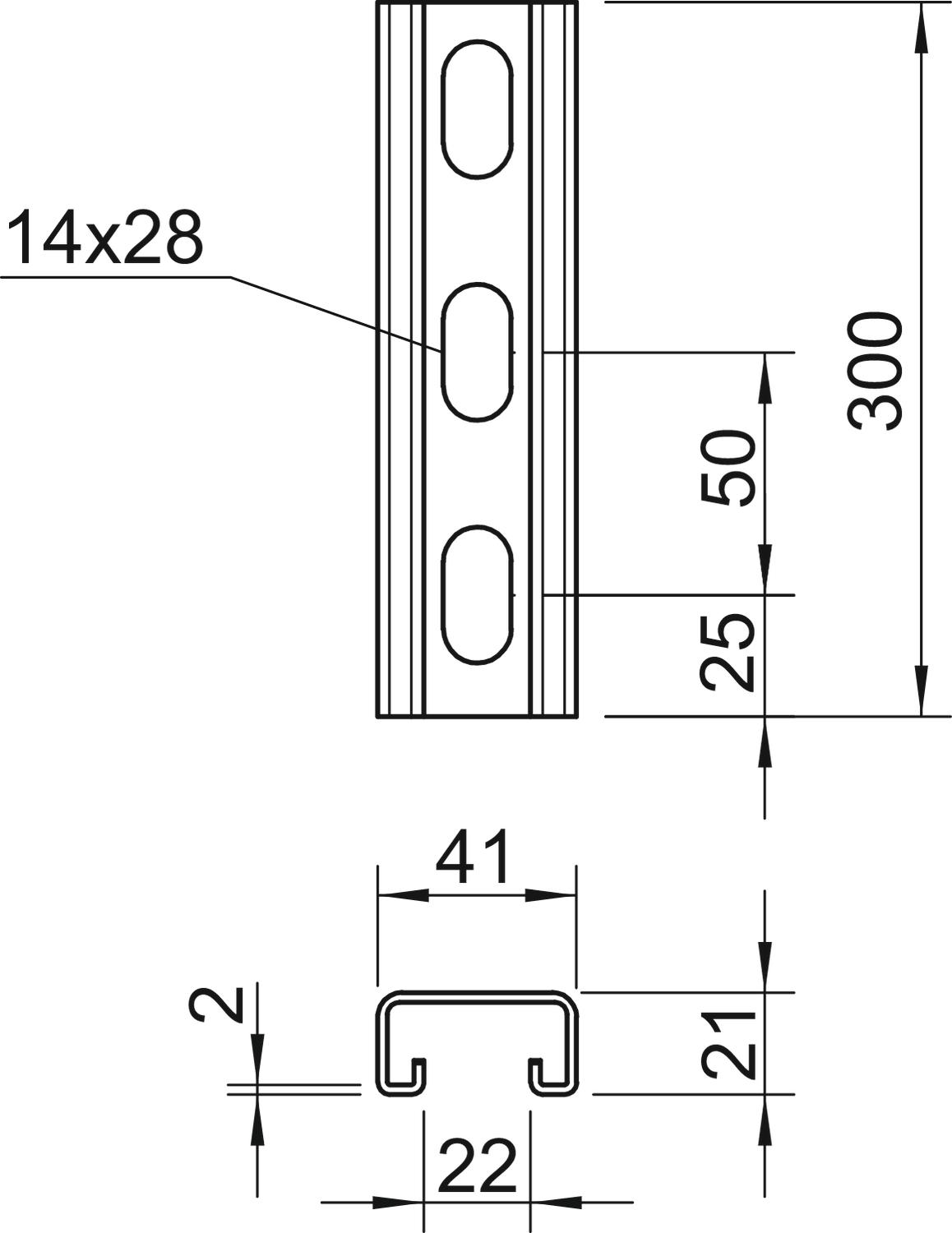 Breakable no CO2 Footprint (GWP) Cradle-to-Gate 0,9545 kg CO2e / 1 Piece Dimension 300x41x21 Dimension L 300 mm Drill hole spacing, centre 50 mm Height 21 mm Hole size 14x28 mm Length 300 mm Maintain electrical functions yes Material Steel Material thickness 2 mm Profile shape C profile Slot width 22 mm Static value A 1,65 cm² Static value ly 0,95 cm⁴ Static value lz 4,51 cm⁴ Static value Wy 0,89 cm³ Static value Wz 2,2 cm³ Surface Hot-dip galvanised Type of perforation Perforated back Version for Single profile Width 41 mm With perforation yes With toothing yes - All types