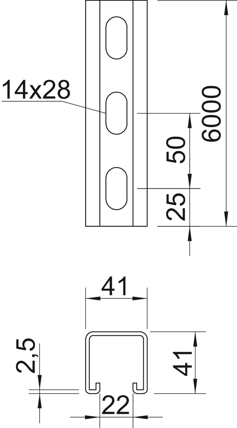 Breakable no CO2 Footprint (GWP) Cradle-to-Gate 5,8913 kg CO2e / 1 Meter Dimension 6000x41x41 Dimension L 6000 mm Drill hole spacing, centre 50 mm Height 41 mm Hole size 14x28 mm Length 6000 mm Maintain electrical functions yes Material Steel Material thickness 2,5 mm Profile shape C profile Slot width 22 mm Static value A 2,97 cm² Static value ly 6,05 cm⁴ Static value lz 9,01 cm⁴ Static value Wy 2,91 cm³ Static value Wz 4,4 cm³ Surface Strip galvanized Type of perforation Perforated back Version for Single profile Width 41 mm With perforation yes With toothing yes - All types