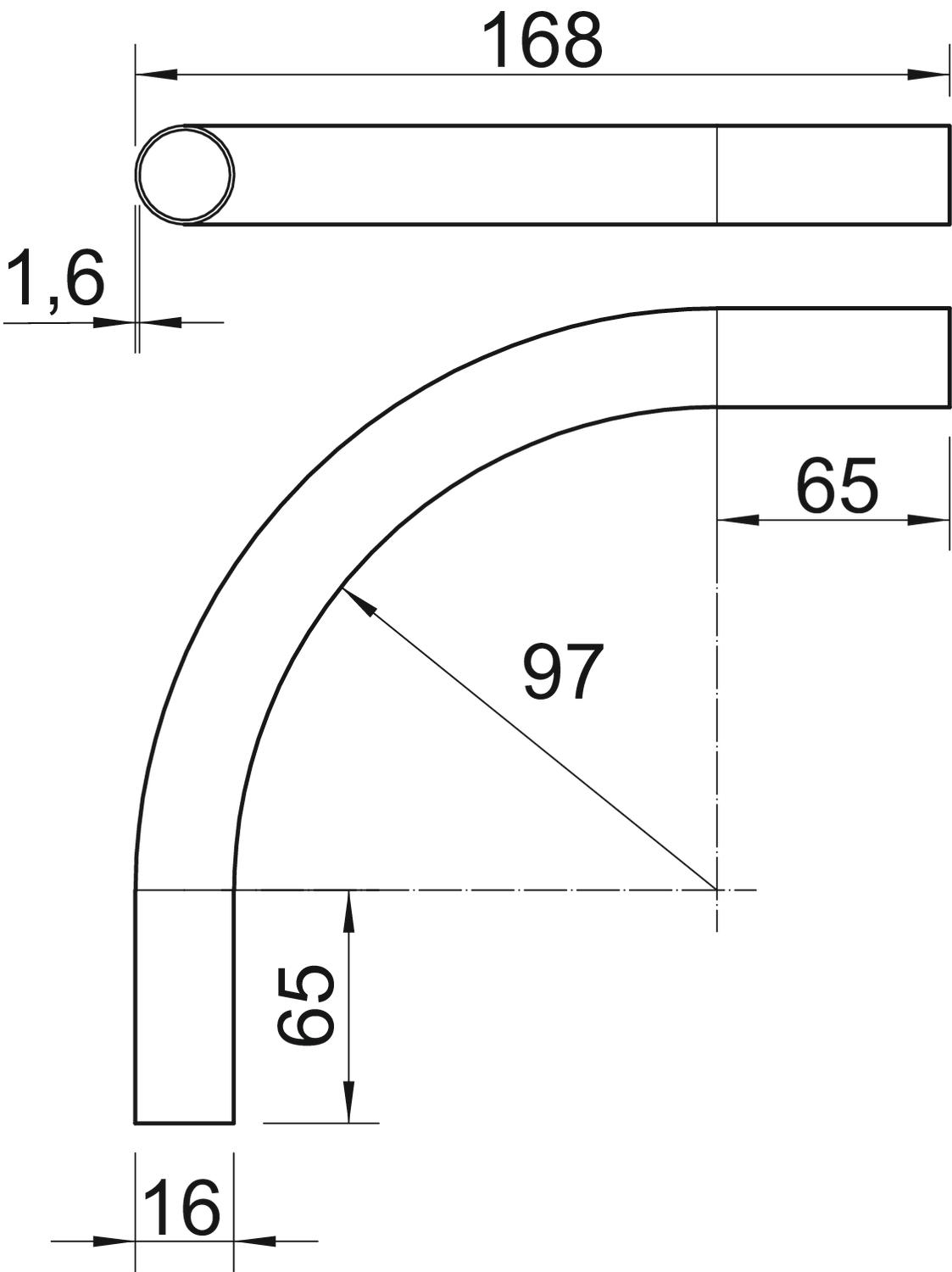 Angle of the bend 90 ° Colour Light grey; RAL 7035 Dimension Ø16mm Dimension A 65 mm Dimension D 16 mm Dimension L 168 mm Dimension m (mm) M16 Dimension R 97 mm Dimension t 1,6 mm Flexible no For nominal pipe diameter 16 mm Halogen-free yes Length 168 mm Material Polycarbonate/Acrylnitrile-butadiene-styrene Version for Connector With sleeve no - All types