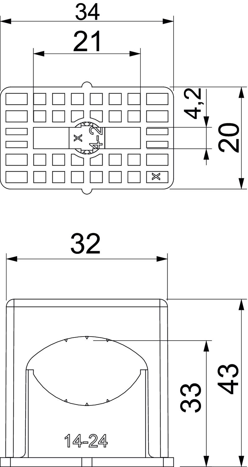 Clamping range D, max. 24 mm Clamping range D, min. 14 mm CO2 Footprint (GWP) Cradle-to-Gate 0,0278 kg CO2e / 1 Piece Colour Light grey; RAL 7035 Dimension 14-24mm Dimension a 34 mm Dimension a1 (mm) 21 mm Dimension b 20 mm Dimension b1 4,2 mm Dimension c 32 mm Dimension d 33 mm Dimension e 43 mm Expandable no Fastening type Screw hole Halogen-free yes Impact-resistant yes Material Polystyrene Number of cables/pipes 1 - All types