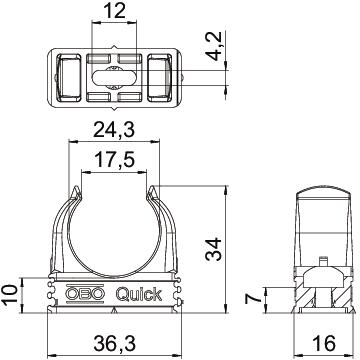 Product descriptionFlame-resistant, flush-mounted clip to accept metric steel armoured pipes and heavy-duty insulating pipes, as well as Quick-Pipe® electrical installation pipes. Universal fastening options on walls and ceilings, both in indoor and protected outdoor areas. With slot for side alignment during mounting with wood screw or knock-in anchor. Toolless pipe mounting. Can also be arranged with OBO Multi-Quick or proQuick clip. M16 - M32 size can be screwed onto M6 thread. Recommended fastening spacing 50–60 cm, for max. extraction values F at a room temperature of 20 °C, see the table.