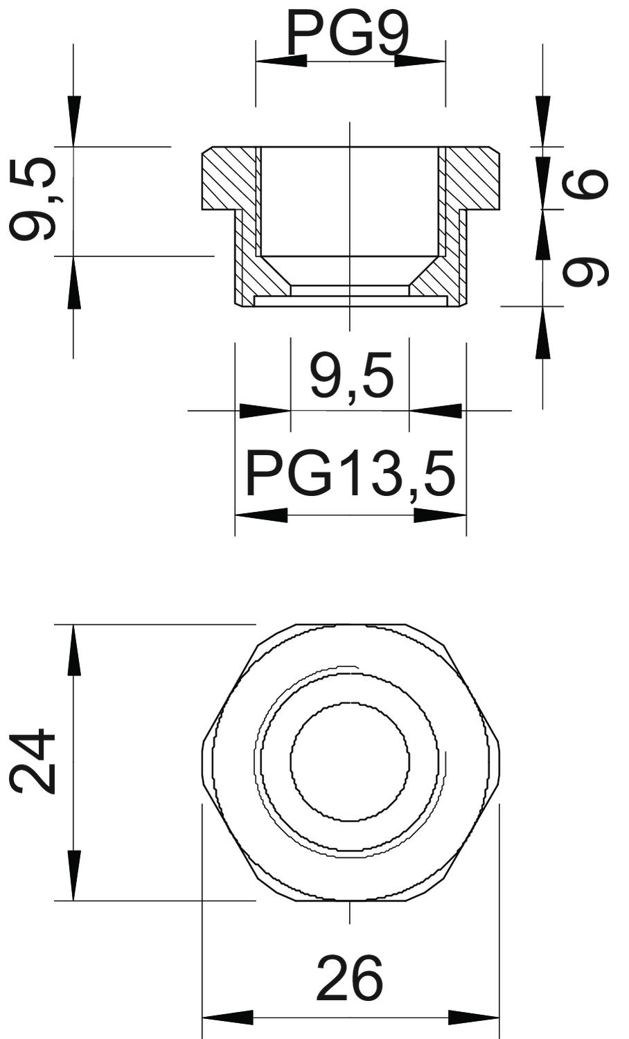 Product descriptionReduction with PG internal and external thread to DIN 40430 for mounting plastic cable glands on enclosures. Protection class IP54 without additional connecting seal. Protection class up to IP68 possible with additional connecting seal, e.g. O-ring or flat sealing ring.