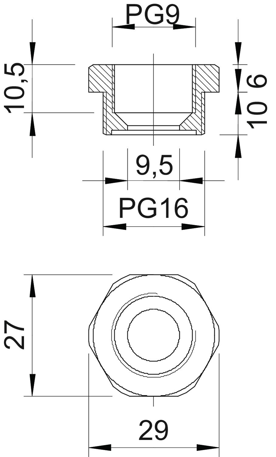 Product descriptionReduction with PG internal and external thread to DIN 40430 for mounting plastic cable glands on enclosures. Protection class IP54 without additional connecting seal. Protection class up to IP68 possible with additional connecting seal, e.g. O-ring or flat sealing ring.