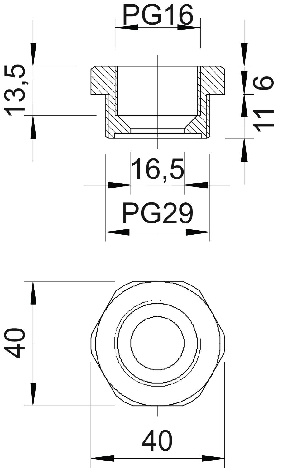 Product descriptionReduction with PG internal and external thread to DIN 40430 for mounting plastic cable glands on enclosures. Protection class IP54 without additional connecting seal. Protection class up to IP68 possible with additional connecting seal, e.g. O-ring or flat sealing ring.