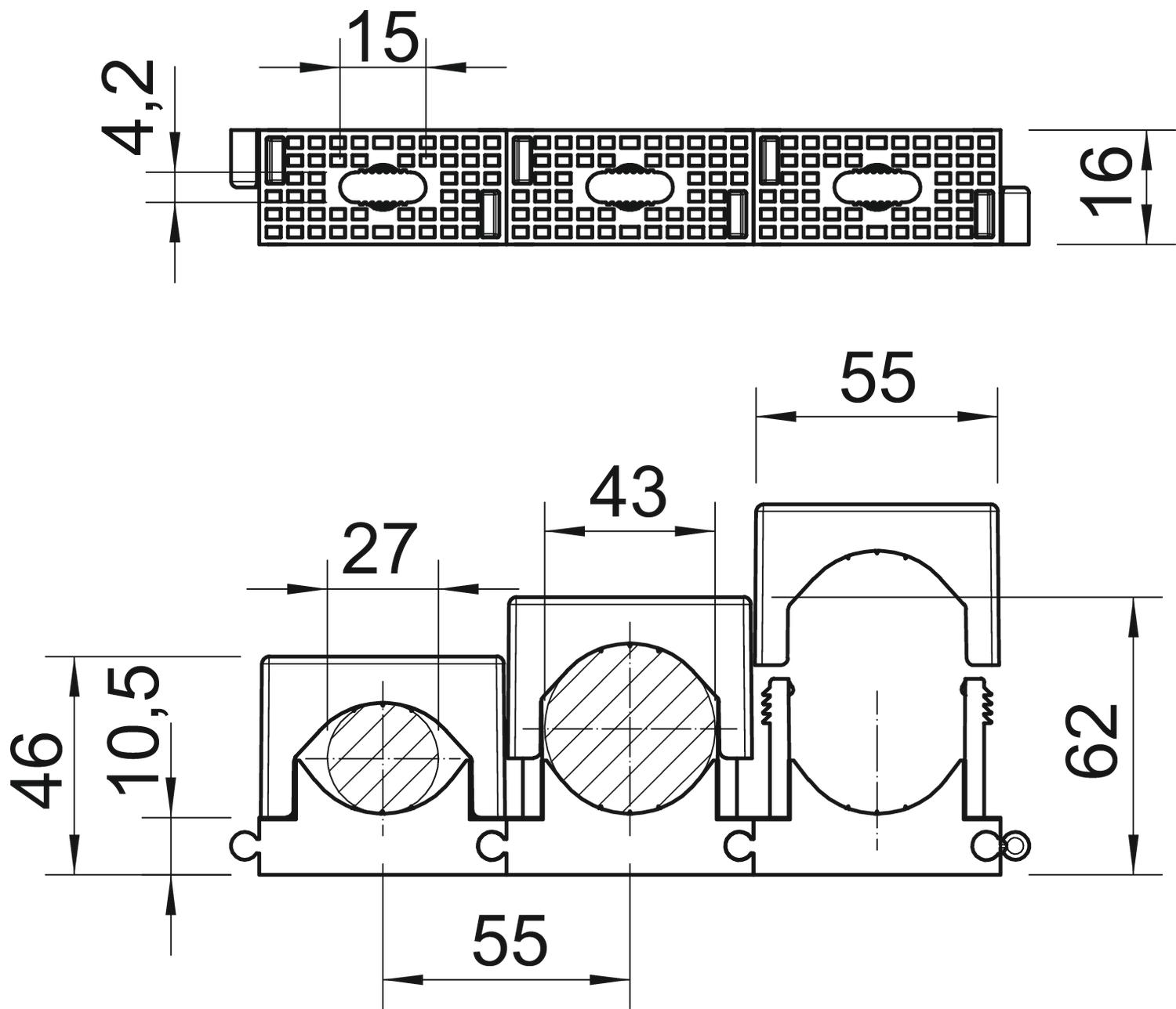 Clamping range D, max. 43 mm Clamping range D, min. 27 mm CO2 Footprint (GWP) Cradle-to-Gate 0,0764 kg CO2e / 1 Piece Colour Light grey; RAL 7035 Dimension 27-43mm Dimension A 55 mm Dimension d max. 43 mm Dimension d min. 27 mm Dimension F 15 mm Dimension H1 10,5 mm Dimension H2 46 mm Dimension H3 62 mm Expandable yes Fastening type Screw hole Halogen-free yes Impact-resistant no Material Polyamide Number of cables/pipes 1 - All types