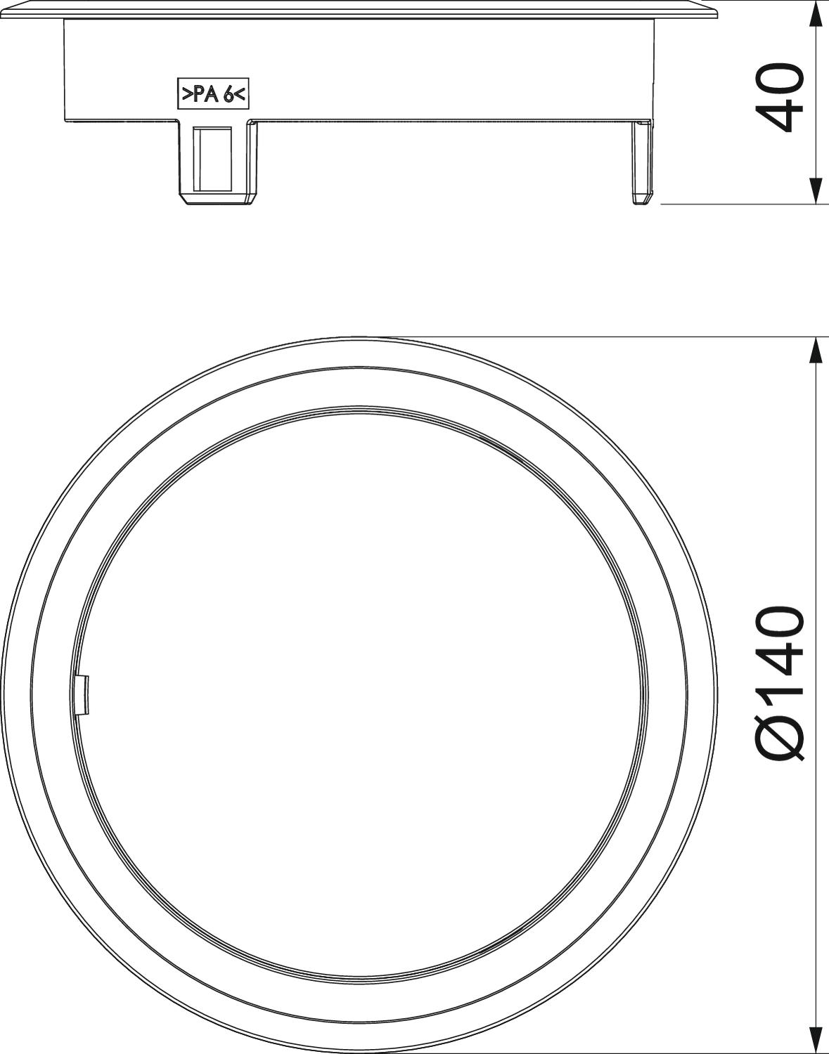 Approvals VDE Cable outlet version No cable outlet CO2 Footprint (GWP) Cradle-to-Gate 0,4053 kg CO2e / 1 Piece Colour Graphite black; RAL 9011 Dimension 140x140x40 External diameter 140 mm Floor care Dry Floor covering protection frame yes Material Polyamide Opening mechanism Tool Protection rating (IP) when unused IP40 Protection rating IK code IK10 Standard EN 50085-2-2 Suitable for cavity floor installation yes Suitable for raised floor installation yes Suitable for underfloor ducts no Suitable for wet care no Version for Round Vertical load, small area to 500 N With floor covering recess no - All types