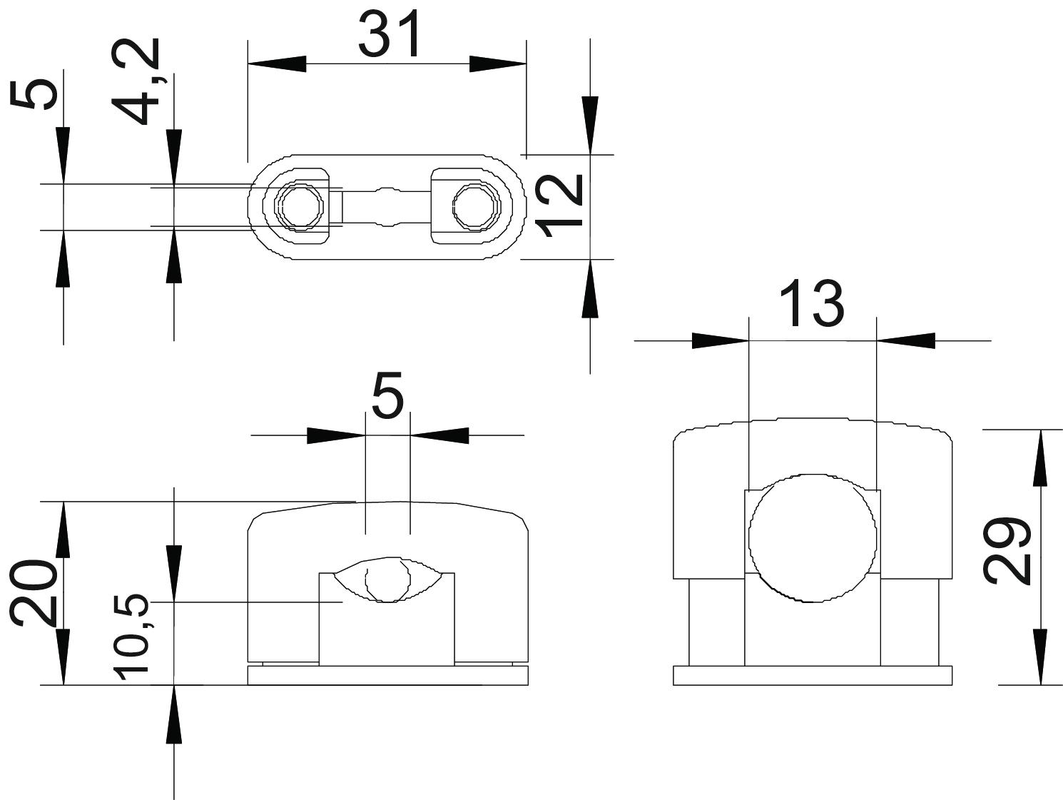 Bolt M5 x 14 Clamping range D, max. 14 mm Clamping range D, min. 5 mm CO2 Footprint (GWP) Cradle-to-Gate 0,0207 kg CO2e / 1 Piece Colour Light grey; RAL 7035 Dimension 5-13mm Dimension b 12 mm Dimension b1 4,2 mm Dimension b2 5 mm Dimension d max. 13 mm Dimension d min. 5 mm Dimension H1 10,5 mm Dimension H2 20 mm Dimension H3 29 mm Dimension L 31 mm Fastening type Screw hole Halogen-free yes Material Polystyrene Number of cables/pipes 1 Plastic-covered no Suitable in fire protection area no UV-resistant no Version for Closed - All types