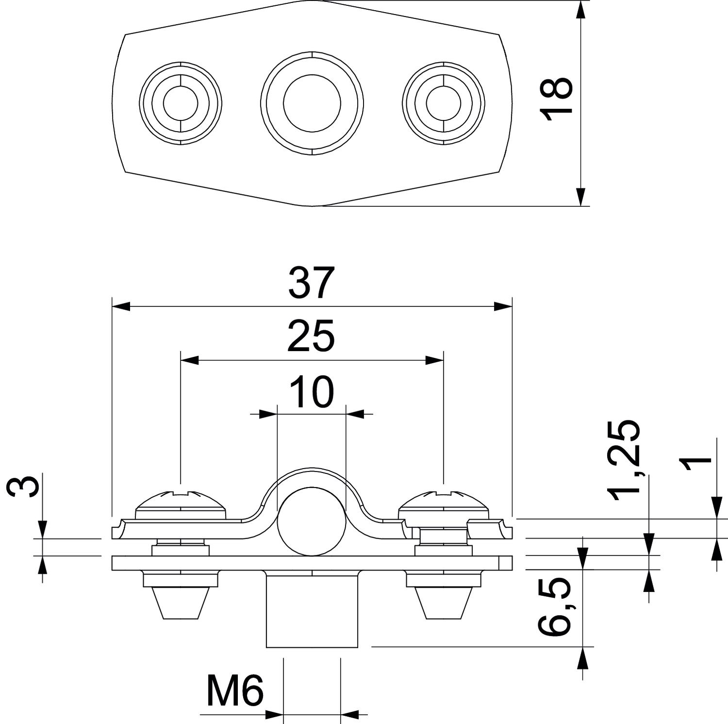 Clamping range D, max. 10 mm Clamping range D, min. 8 mm CO2 Footprint (GWP) Cradle-to-Gate 0,0461 kg CO2e / 1 Piece Dimension 8-10mm Dimension A 37 mm Dimension b 18 mm Dimension B 25 mm Dimension D 10 mm Dimension d max. 10 mm Dimension d min. 8 mm Dimension H1 6,5 mm Dimension t1 (mm) 1 Dimension t2 (mm) 1,25 Dimension x 3 mm Distance to the wall yes Fastening type Threaded connection For diameter 8 - 10 Halogen-free yes Maintain electrical functions yes Material Steel Material thickness 1,25 mm Number of cables/pipes 1 Plastic-covered no Surface Electrogalvanized UV-resistant yes Version for Closed - All types