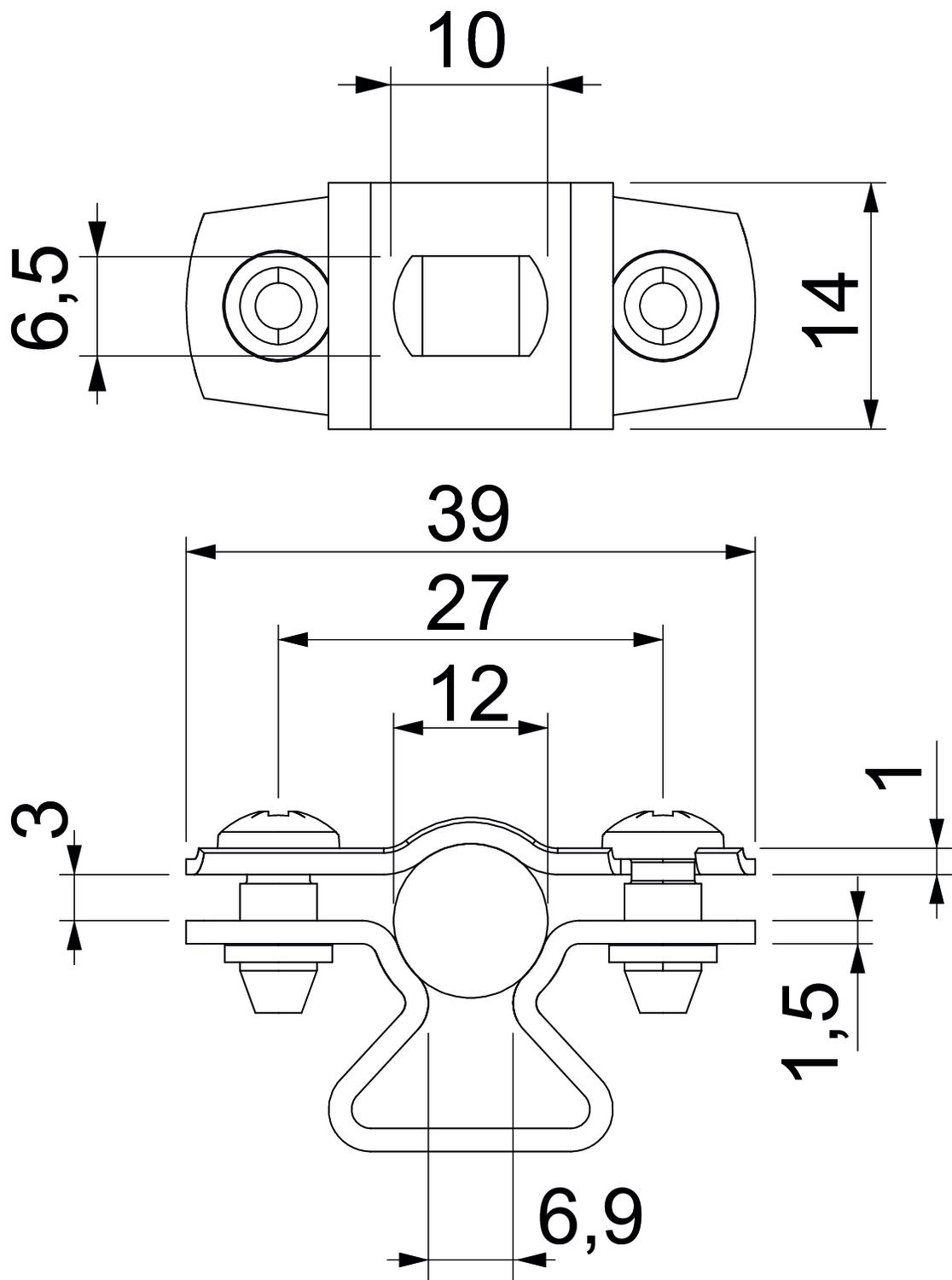 Clamping range D, max. 12 mm Clamping range D, min. 10 mm CO2 Footprint (GWP) Cradle-to-Gate 0,1389 kg CO2e / 1 Piece Dimension 10-12mm Dimension A 39 mm Dimension B 27 mm Dimension b 14 mm Dimension d max. 12 mm Dimension d min. 10 mm Dimension L 10 mm Dimension s 6,9 mm Dimension t1 (mm) 1 Dimension t2 (mm) 1,5 Dimension x 3 mm Distance to the wall yes For diameter 10 - 12 Halogen-free yes Maintain electrical functions yes Material Stainless steel 1.4301 Material thickness 1,5 mm Number of cables/pipes 1 Plastic-covered no UV-resistant yes Version for Closed - All types