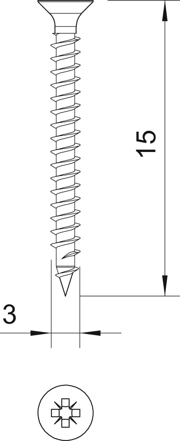 Dimension 3x15mm Dimension D 3 mm Dimension L 15 mm Hardened yes Head diameter 5,6 mm Head shape Countersunk head Length 15 mm Material Steel Screw system Pozidrive PZ Surface Electrogalvanized - All types