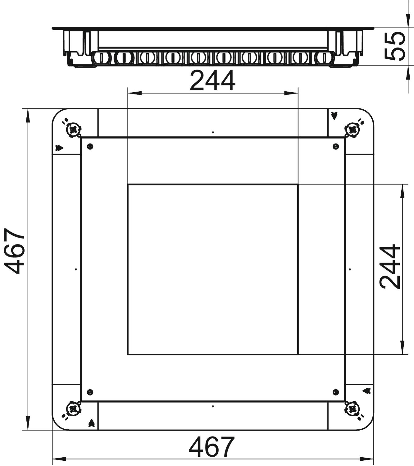 Product descriptionUnderfloor accessory box with mounting lid and lid blanking plate with sheet steel side walls. For the installation of a square GES9 55 service outlet in screed heights of 55 mm or more. Height can be infinitely adjusted to the nominal screed height and the screed can be worked flush to the screed scraping edge. With 7 x M20, 3 x M25, 4 x M32 pipe insertion openings on each side. Usable pipe size at a system height of 55 mm: M20.