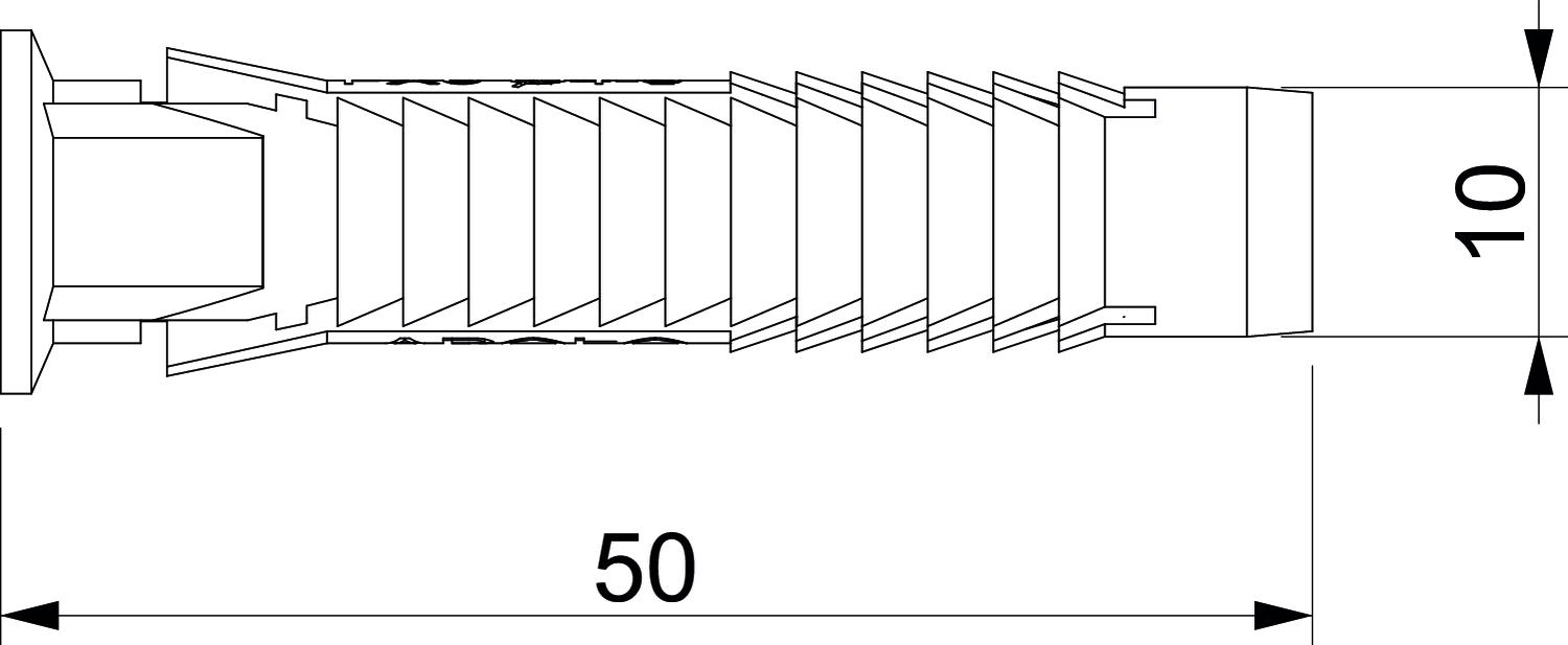 Colour Light grey Diameter 10 mm Dimension 10x50 Dimension D 10 mm Dimension L 50 mm Drill hole diameter, min. 10 mm Length 50 mm Material Polyethylene Pull-out value 1280 N Suitable for fastening with cable ties no Suitable for hexagonal wood screw yes Version for Universal anchor With bolts no Wood screws 6-8 - All types
