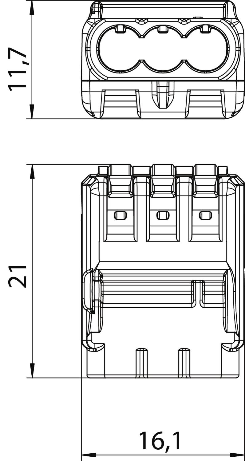 Colour Transparent Connectable conductor cross-section, multi-wire, max. 2,5 mm² Connectable conductor cross-section, multi-wire, min. 0,2 mm² Connectable conductor cross-section, single-wire, max. 2,5 mm² Connectable conductor cross-section, single-wire, min. 0,2 mm² Cross-section 3 x 0.2 - 2.5 mm² multi-wire cables / single-wire conductors mm² Dimension 0,2-2,5mm² Flame-resistant Acc. to VDE 0471/DIN 695 Part 2-1, test temperature 850°C Height 11,7 mm Insulation material Thermoplast Length 16,1 mm Material Polycarbonate No. of terminals 3 Nominal cross-section, max. 2,5 mm² Nominal cross-section, min. 0,2 mm² Nominal current 24 A Nominal voltage 450 V Permitted temperature range, max. 85 °C Permitted temperature range, min. -5 °C Pole number 1 Suitable for flexible conductors yes Suitable for multi-wire conductors yes Suitable for solid conductors yes Width 21 mm With actuating levers yes - All types
