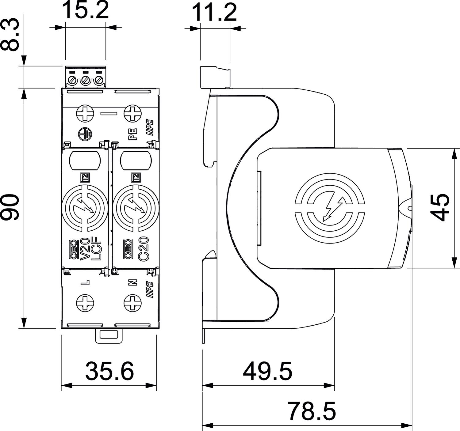 • Discharge capacity to 30 kA (8/20) per pole through a high-performance series connection of varistor and spark gap