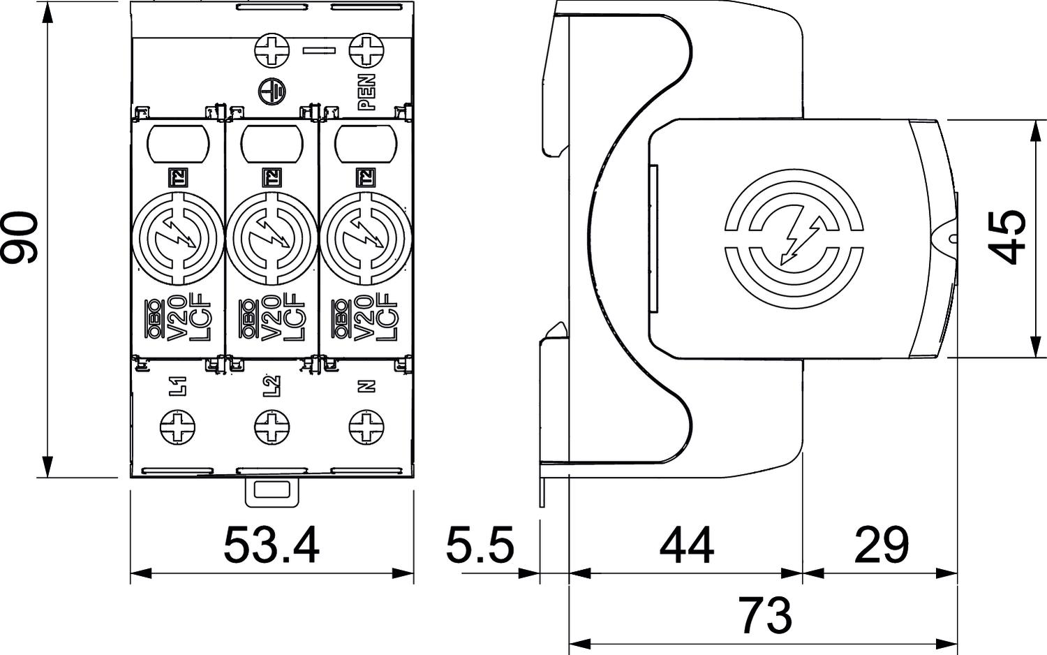 Arrester surge current (8/20 µs) [total] 90 kA Blow-out no CO2 Footprint (GWP) Cradle-to-Gate 1,761 kg CO2e / 1 Piece Conductor cross-section, flexible (fine-wire), max. 35 mm² Conductor cross-section, flexible (fine-wire), max. 2 AWG Conductor cross-section, flexible (fine-wire), min. 16 AWG Conductor cross-section, flexible (fine-wire), min. 1,5 mm² Conductor cross-section, rigid (single-wire/multiwire), max. 2 AWG Conductor cross-section, rigid (single-wire/multiwire), max. 35 mm² Conductor cross-section, rigid (single-wire/multiwire), min. 1,5 mm² Conductor cross-section, rigid (single-wire/multiwire), min. 16 AWG DC network form no Dimension 280V Housing material surge protection components PA UL 94 V-0 Humidity, max. 95 % Humidity, min. 5 % Installation type DIN rail 35 mm Integrated back-up fuse no IT network form no Max. mains-side overcurrent protection 160 A gL/gG Maximum back-up fuse 160 A Maximum continuous voltage (L-N) 280 V Maximum continuous voltage AC 280 V Maximum discharge current (8/20 μs) 30 kA Maximum discharge current (8/20 μs) [L-N] 30 kA Minimum distance 1,5 mm Nominal discharge current (8/20 µs) 20 kA Nominal discharge current (8/20 µs) [L-N] 20 kA Nominal voltage AC (50/60 Hz) 230 V Operating temperature, max. 80 °C Operating temperature, min. -40 °C Other network form no Permitted temperature range, max. 80 °C Permitted temperature range, min. -40 °C Pole version 3 Protection level [L-N] ≤1,5 Protection rating IP20 Remote signalling no Residual voltage [L-N] @ 1 kA 0,8 kV Residual voltage [L-N] @ 5 kA 1 kV Short-circuit resistance for max. mains-side overcurrent protection 50 kA eff Short-circuit resistant yes Signalling on device Visual SPD to EN 61643-11 Type 2+3 SPD to IEC 61643-1 Class II+III SPD to UL 1449 Type 4 Test class, type 2 yes TN network form yes TN-C network form yes TN-C-S network form yes TN-S network form yes Torque 4 Nm TOV voltage [L-N] ‒ fail safe mode ‒ 120 min. 440 V TOV voltage [L-N] ‒ withstand mode ‒ 5 s 335 V TOV voltage [N-PE] ‒ withstand mode ‒ 200 ms 1200 V TT network form no - All types