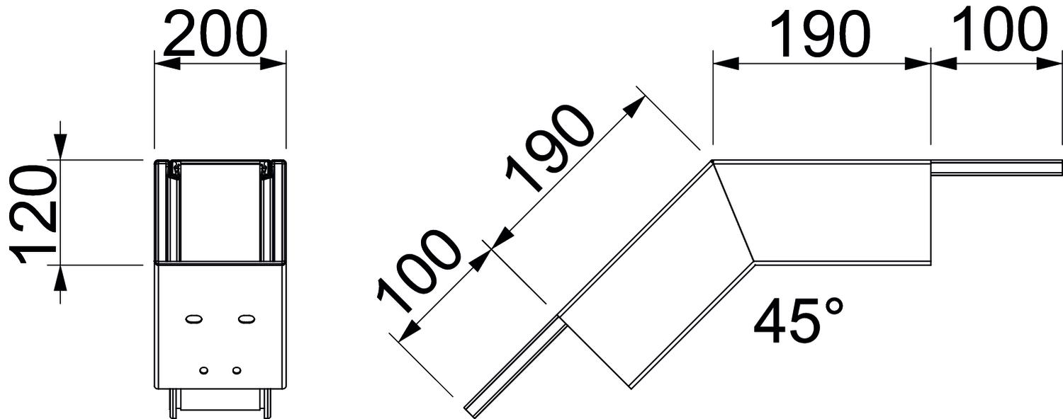 Angle of the bend 45 ° Classification EI − installation duct 90 CO2 Footprint (GWP) Cradle-to-Gate 8,02 kg CO2e / 1 Piece Colour zinc Cover fastening Miscellaneous Dimension 498x100x215 Dimension A 190 mm Dimension B 200 mm Dimension H 120 mm Jacketing Steel Material Steel Number of flammable sides 4 Partitions possible no Surface Strip galvanized Usable cross-section 18500 mm² With perforation yes - All types