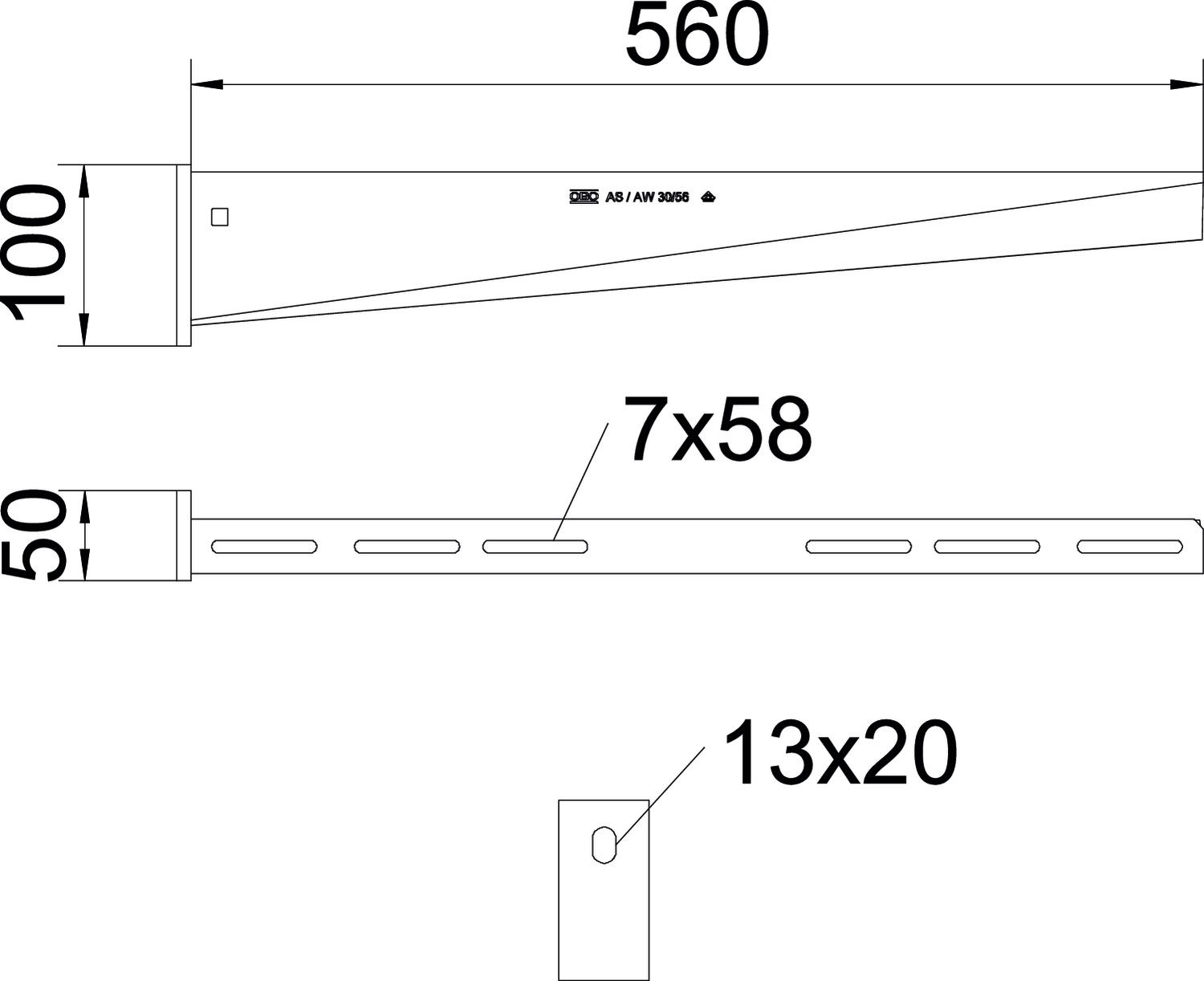 Angle range, max. 90 mm Angle range, min. 90 mm CO2 Footprint (GWP) Cradle-to-Gate 3,8849 kg CO2e / 1 Piece Colour zinc Dimension B560mm Dimension A 50 mm Dimension B 560 mm Dimension H 100 mm EPD article yes F in kN 3 kN Height 100 mm Hole diameter 13 mm Length 50 mm Maintain electrical functions no Material Steel Rustproof steel, pickled no Surface Hot-dip galvanised Version for Wall and support bracket Width 560 mm Technical data