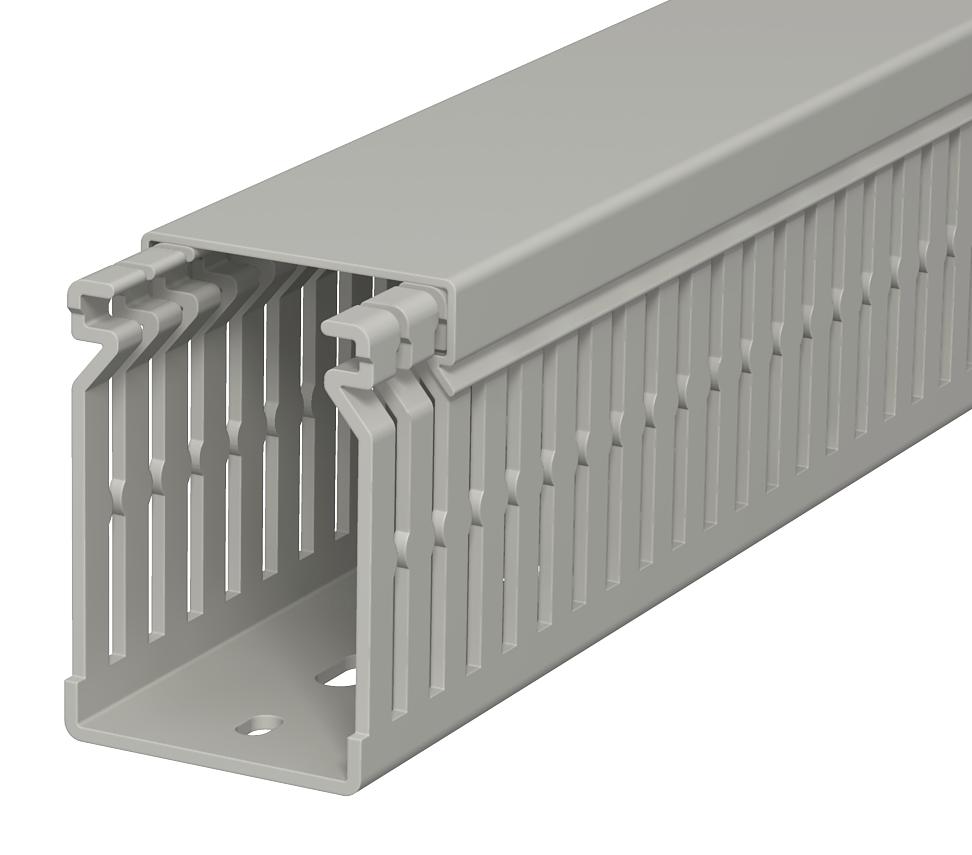 Product descriptionWiring duct, incl. cover and base perforation, for horizontal and vertical routing of electrical cables in the switchgear cabinet. Designed as a metric duct. The nominal dimension of the system size corresponds to the internal dimension of the duct. Retainers are broken out without tools. The flush-floor routing of cables is possible through predetermined break points. Tapering in the side slots prevents the cables from falling out. Tested to DIN EN 50085-2-3. Special lengths on request.