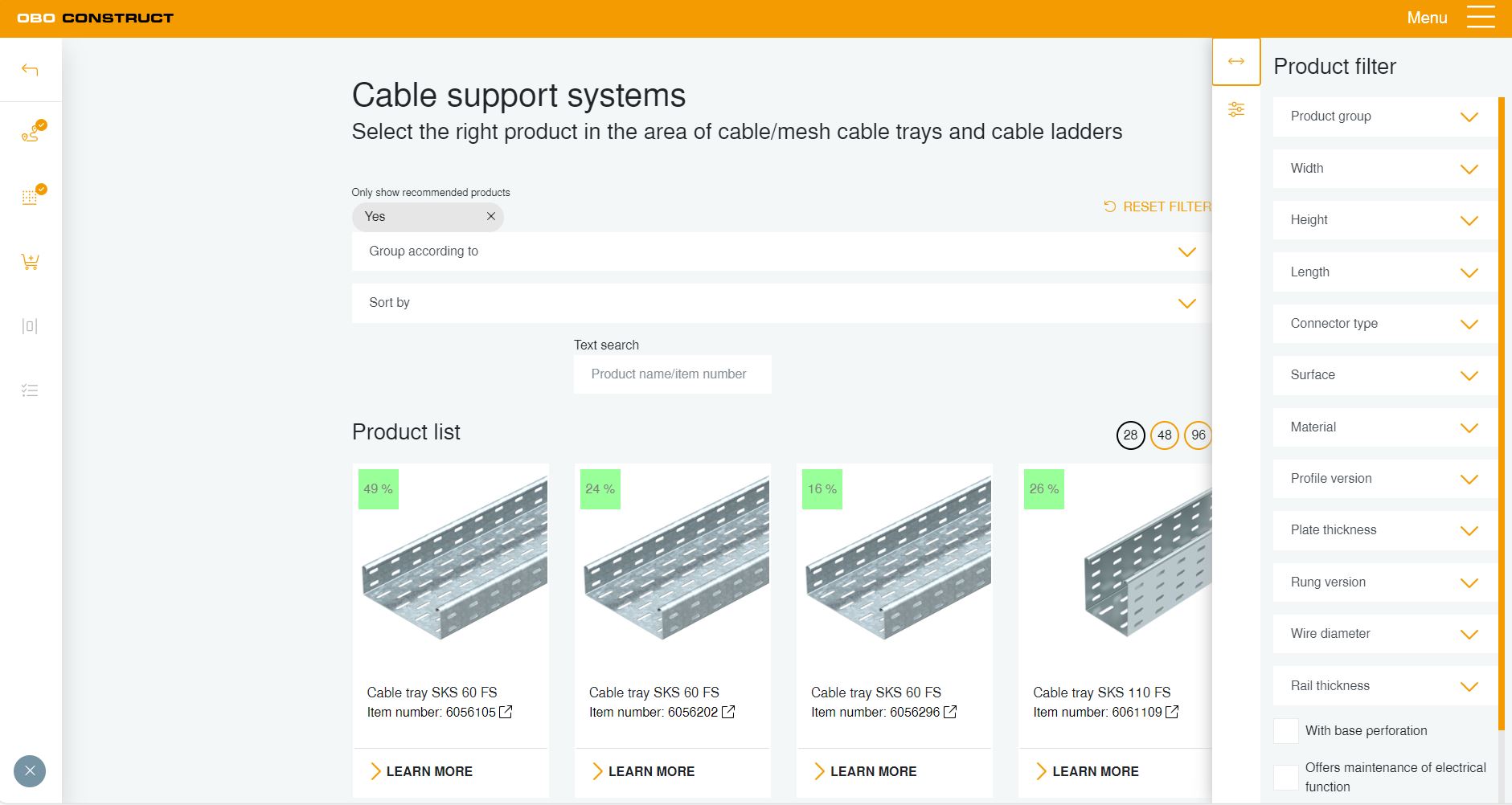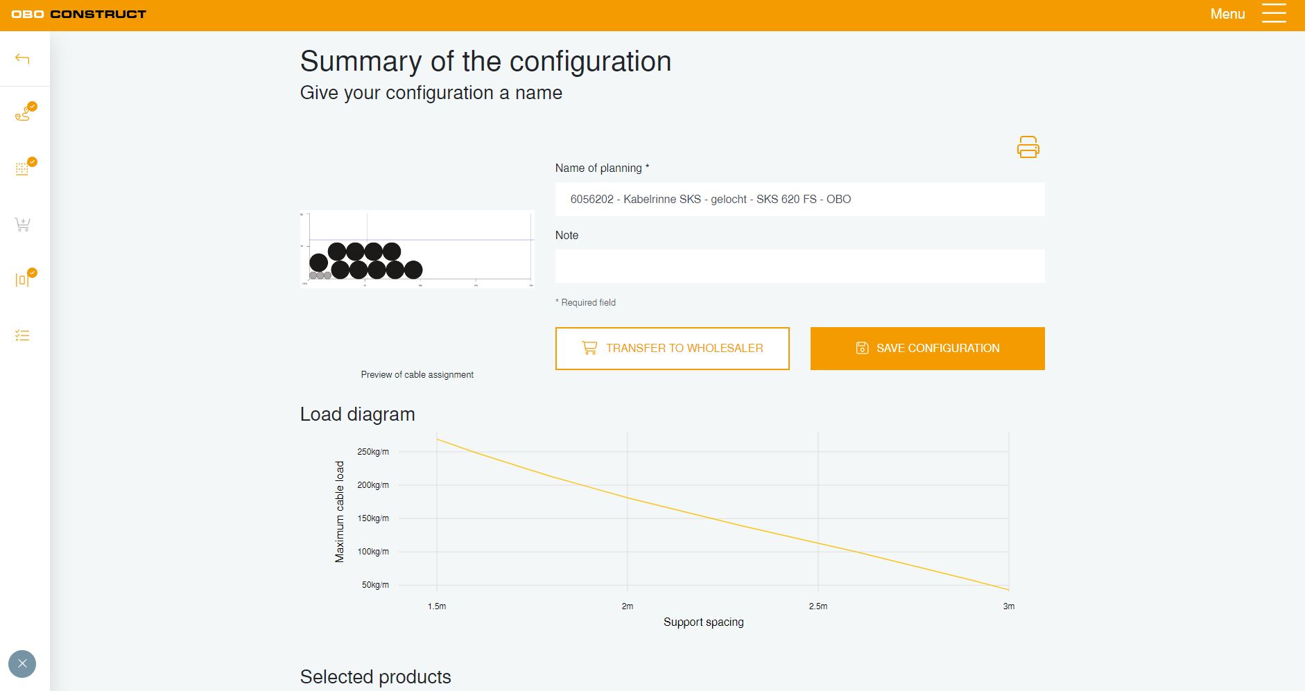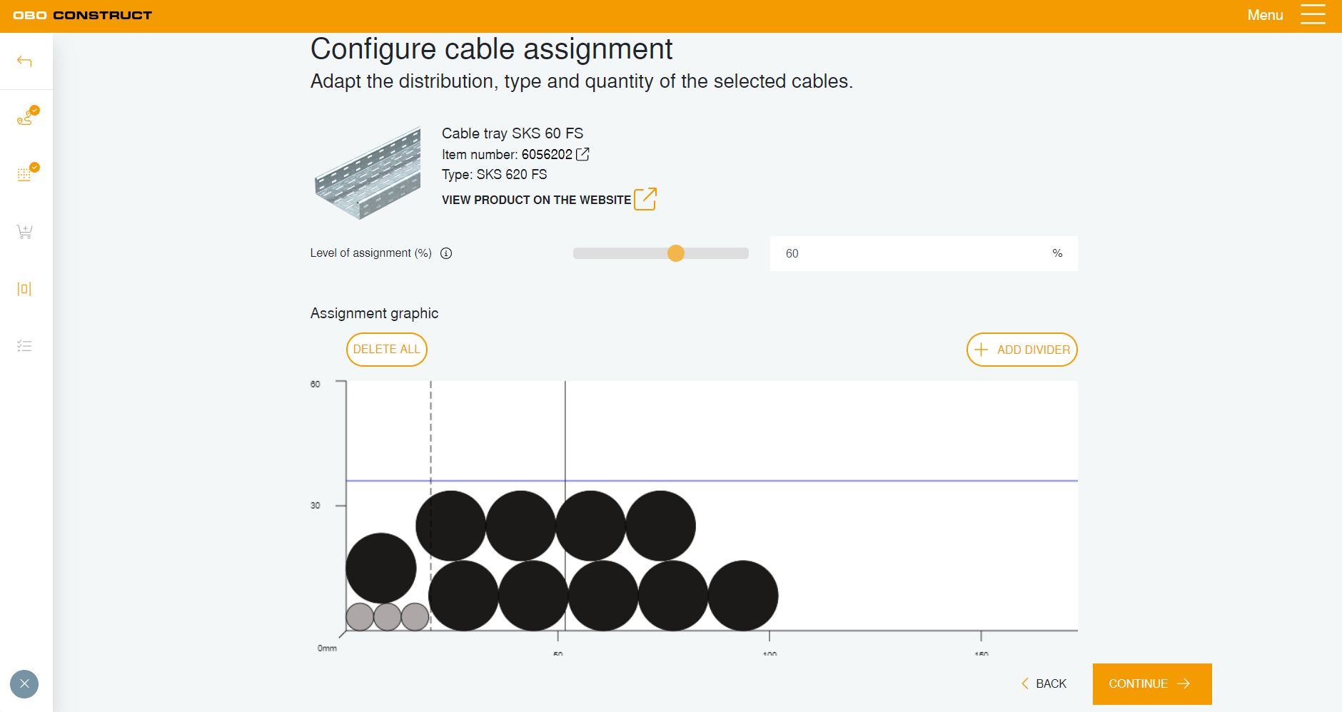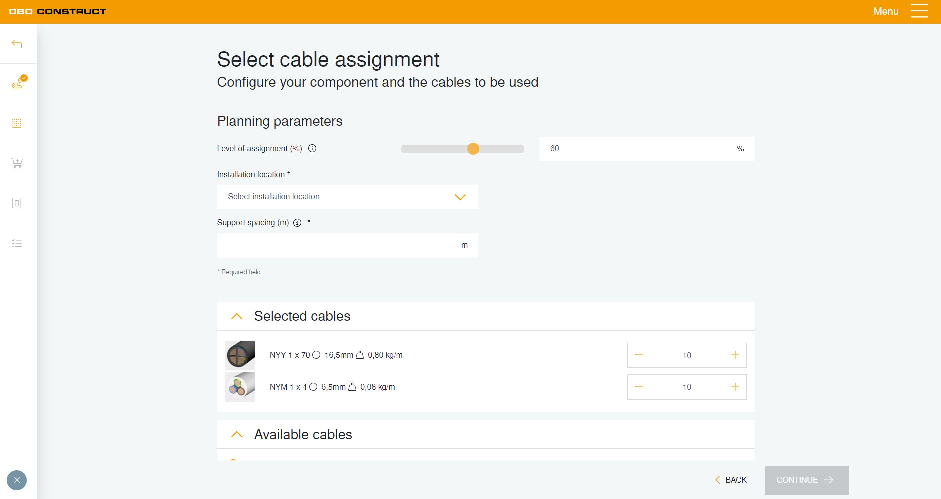 Within a project, the planning tool makes it possible to calculate the cable volume both for cable support systems and for underfloor ducts and trunking. Various assignment parameters, such as the installation location, support spacing, level of assignment, as well as the quantity and type of cables can be selected, leading the user, step by step, to the selection of products.