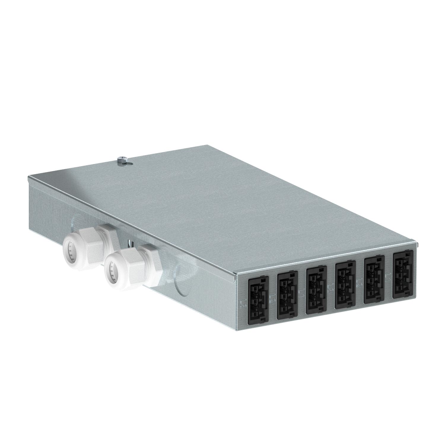 Izlaz: 12 samozaključavajućih utičnih spojnica, 3-polni, beli (6x) i crni (6x), 25 A, tip WINSTA® MIDI (utičnica: po trofaznom strujnom kolu 2 x L1, 2 x L2, 2 x L3).