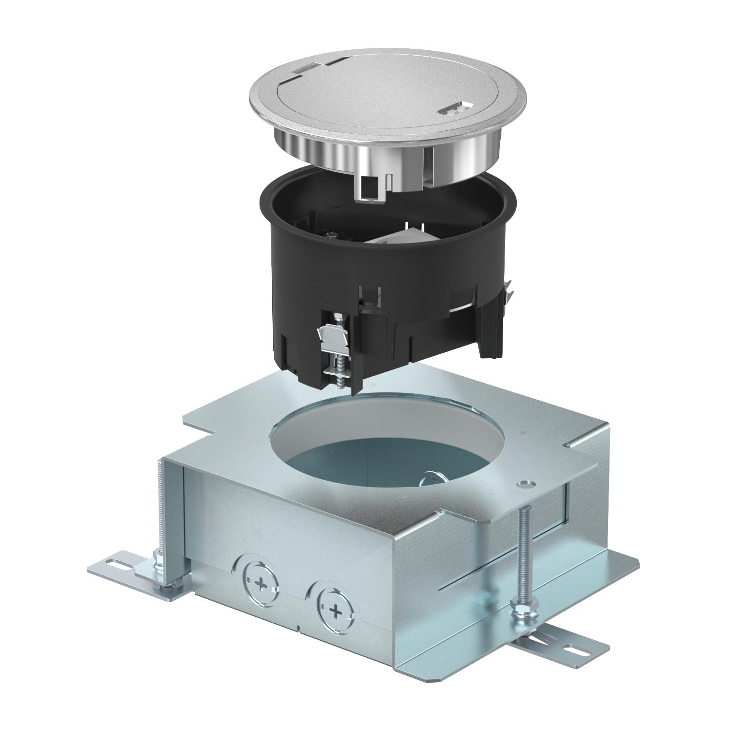 Opis proizvodaOkrugla GES R2 kutija sa poklopcem na šarkama, zaštitnim okvirom podne obloge i UD GES R2 doznom za košuljicu za ugradnju u podove sa konstrukcijom košuljice u zatvorenom prostoru. Ugrađena jedinica sa dvostrukom utičnicom sa zaštitnim kontaktom sa smerom priključka od 33°. Bočno pored utičnice opciono se nalaze do 2 priključne utičnice za primenu u tehnici prenosa podataka. Ugradna jedinica se može mokro čistiti kada je zatvorena. Minimalna dubina ugradnje je 85 mm. Hromirana površina.