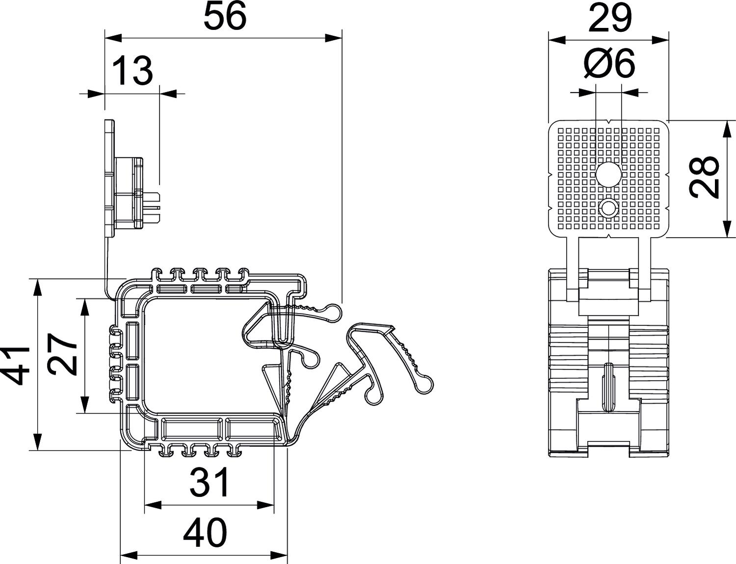 Opis proizvodaSabirni držač sa profilisanim pričvrsnim elementom, za montažu do 10 kablova NYM 3 x 1,5 mm² na zid ili plafon. Pričvršćivanje sa udarnim tiplom ili utičnim tiplom. Takođe pogodno za pričvršćivanje pomoću alata za postavljanje na gas i baterije marke Bosch, Fischer i Spit (prečnik prednjeg dela, unutrašnji Ø 7 mm). Pričvrsna rupa Ø 6 mm. Preporučeno rastojanje učvršćivanja kod pune ispune: 250-400 cm, zavisno od datih važećih nacionalnih propisa/standarda.