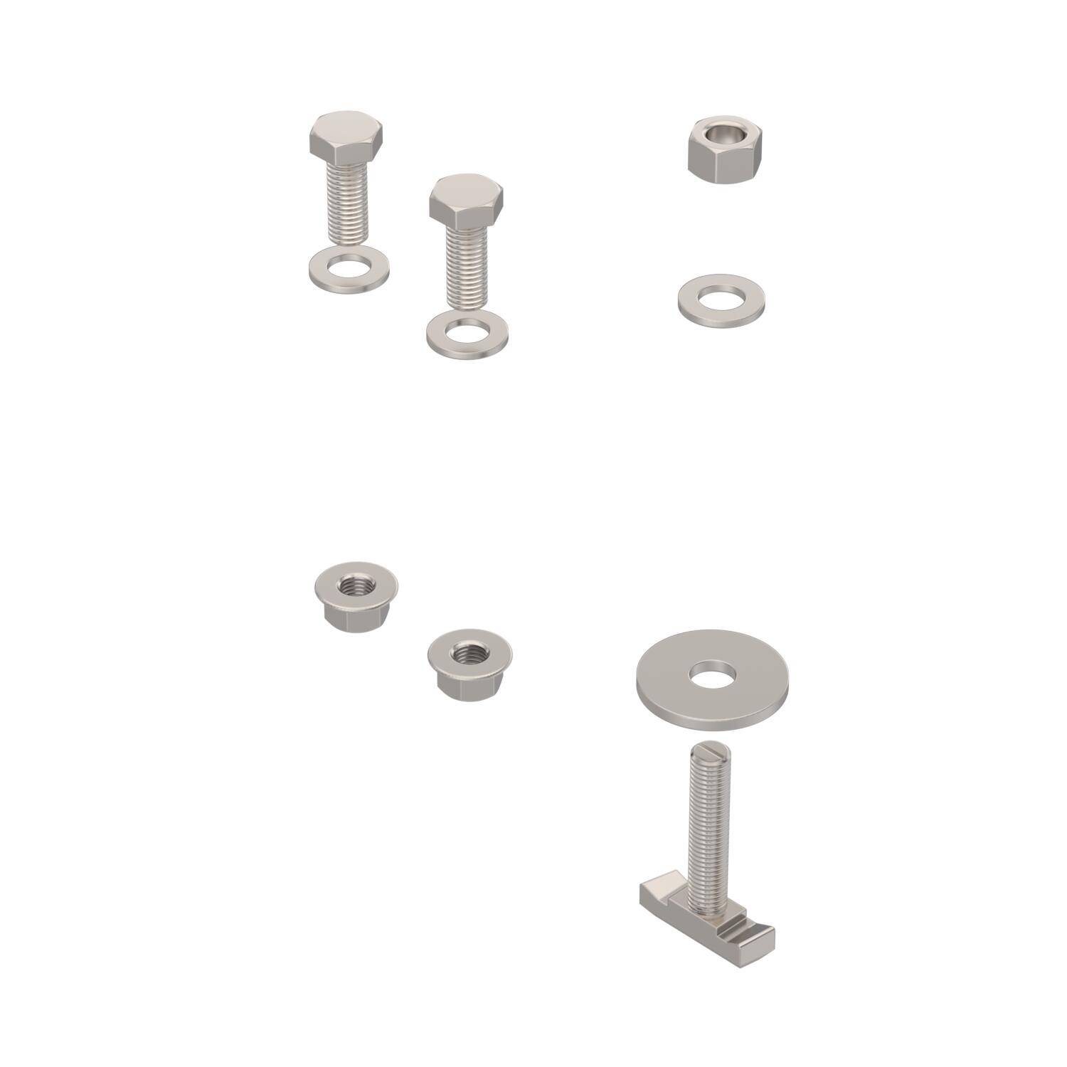 Opis proizvodaKomplet zavrtnjeva koji se sastoji od šestougaonih zavrtnjeva M12, šestouganih navrtki sa prirubnicom M12, zavrtnjeva sa kukastom glavom i podloški. Za pričvršćivanje perforiranih traka tipa LB FT na zadnje podupirače unapred montiranih nosača PV montažnog sistema na otvorenom.