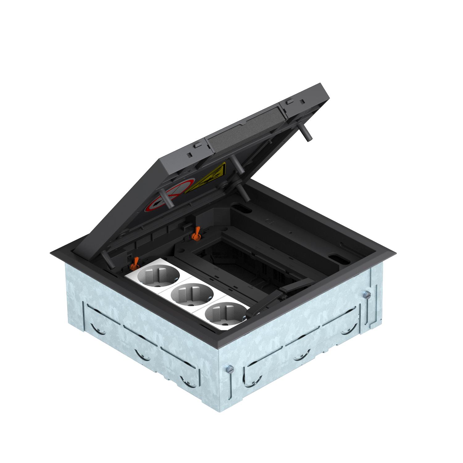 Opis proizvodaKvadratna instalaciona jedinica za šest Modul 45 instalacionih uređaja, za upotrebu u šupljim podovima i podnim košuljicama sa hemijskim čišćenjem u zatvorenom prostoru, sastoji se od instalacionog kućišta, kutije GES4-2, dva UT univerzalna nosača i trostruke utičnice 33° sa kontaktom za uzemljenje, belo. Ugradno kućište sa obeleženim otvorima za uvođenje cevi za provodnike (M25), podesivo na gornju ivicu košujice. Ugradno kućište se isporučuje zatvoreno maskirnim poklopcem. Kutija za uređaje može posle radova na košuljici da se stavi u nastali montažni otvor. Kružni žleb podne obloge u preklopnom poklopcu kutije za uređaje 3, 5, 8 ili 10 mm.
