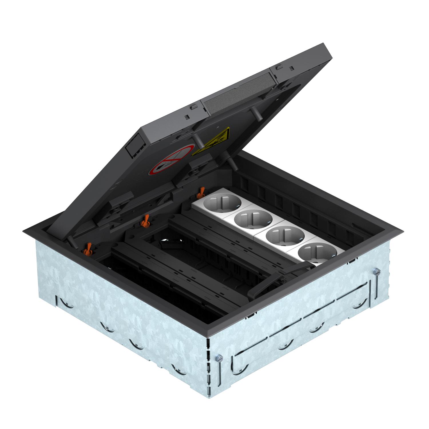 Opis proizvodaKvadratna podna kutija za dvanaest Modula 45, za upotrebu u suvo održavanim podovima u zatvorenom, sastoji se od kućišta za, kutije GES9-2, 3 UT univerzalne dozne i dve 2-struke utičnice 33 °, u beloj boji. Ugradno kućište sa obeleženim otvorima za uvođenje cevi za provodnike (M25), podesivo na gornju ivicu košujice. Ugradno kućište se isporučuje zatvoreno maskirnim poklopcem. Kutija za uređaje može posle radova na košuljici da se stavi u nastali montažni otvor. Kružni žleb podne obloge u preklopnom poklopcu kutije za uređaje 3, 5, 8 ili 10 mm.