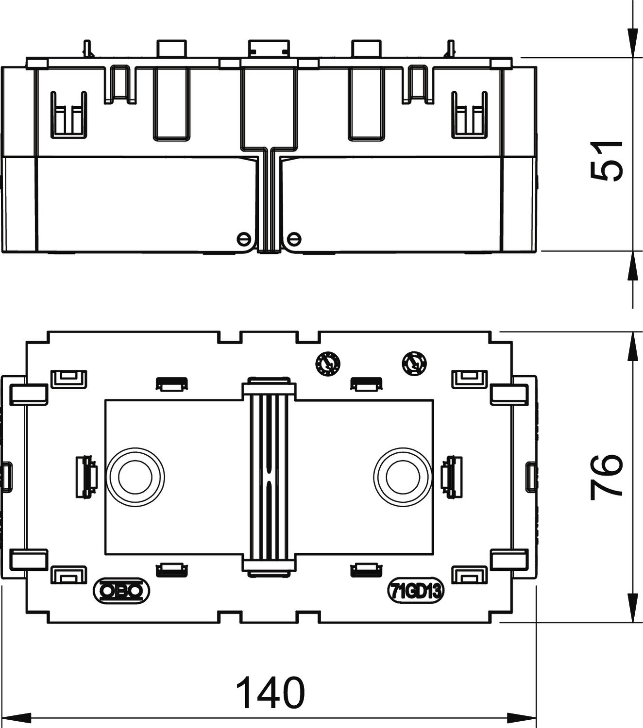 Opis proizvodaČeono uskočna 2-struka kutija za uređaje za sistem Modul 45®, sa preklopnim donjim delom koji po potrebi može da se ukloni, za brzi priključak provodnika, sa dovodnim otvorima za prečnike kablova do 14 mm.