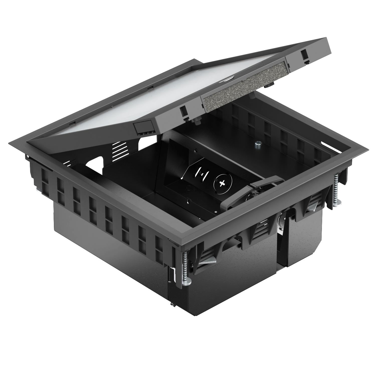 Opis proizvodaPodne kutije GES na nivou poda u kvadratnom dizajnu mogu se, prema standardu, koristiti samo u zatvorenim prostorijama sa suvo održavanim podovima. Ugrađuju se u podna kućišta i duple podove. Može se instalirati do 14 instalacionih uređaja. Minimalna dubina ugradnje je 120 ili 125 mm bez podne obloge. Servisne utičnice sastoje se od montažnog nosača za vertikalnu ugradnju dodataka u italijanskom stilu, zaštitnog okvira za tepih, uključujući okvir za umetanje montažnog nosača sa ugrađenim merdevinama za spuštanje montažnog nosača u koracima od 5 mm za maks. 20 mm i poklopac na šarkama koji je zatvoren i zaključan u okviru za zaštitu tepiha. Poklopac na šarkama ima stabilnu ploču za apsorpciju pritiska izrađenu od 4 mm toplo pocinkovanog čelika, okretni izlaz kabla sa zaptivkom od pene i uvlačivu ručku za otvaranje poklopca. U udubljenje u poklopcu sa šarkama postavlja se podna obloga.