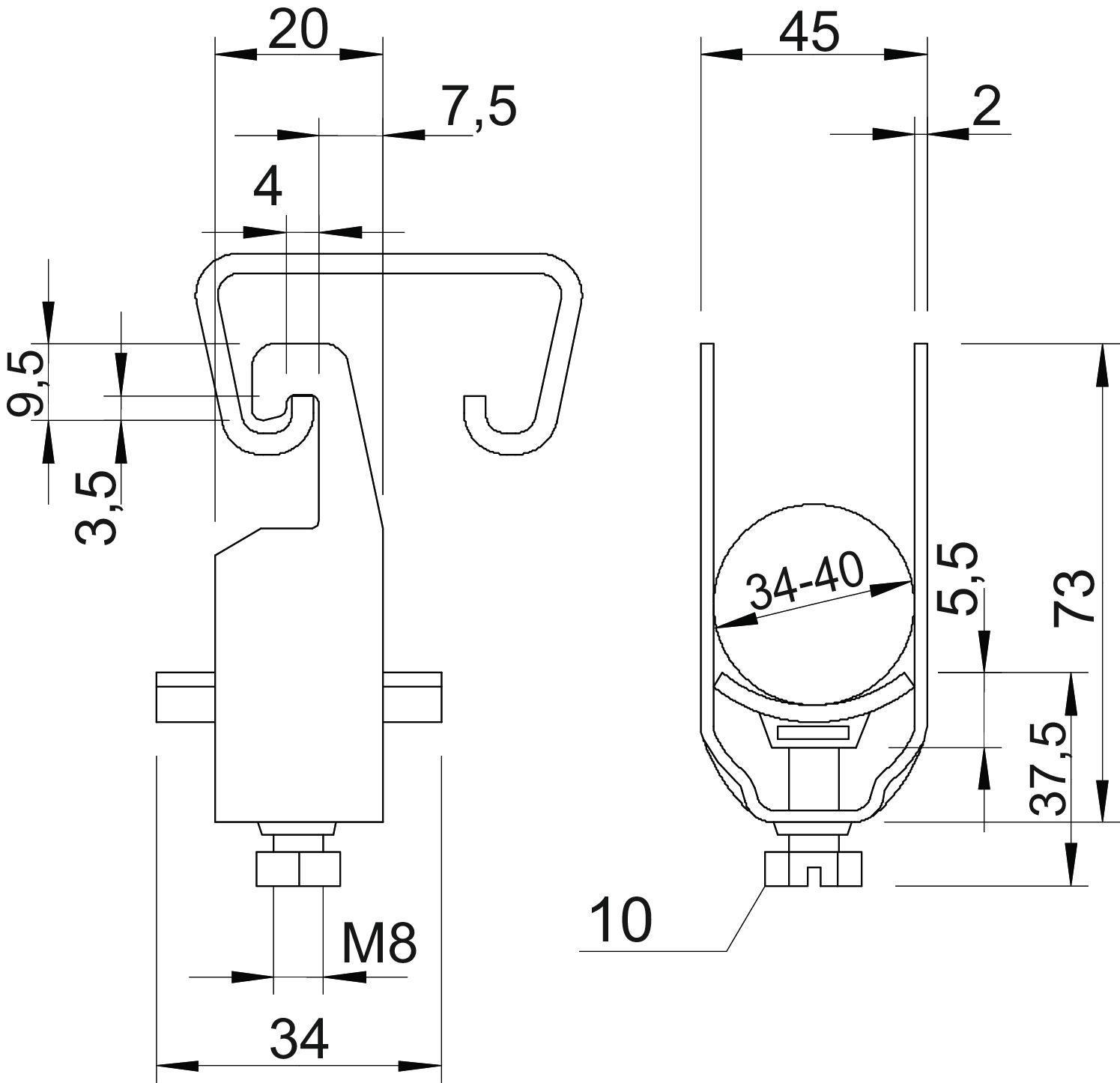 bez halogena da Broj kablova/cevi 1 CO2 otisak (GWP) od kolevke do kapije 0,1451 kg CO₂e / 1 Komad Dimenzija 34-40mm Dimenzija A 20 mm Dimenzija B 45 mm Dimenzija C 34 mm Dimenzija G (mm) M8 Dimenzija H 73 mm Dimenzija L 37,5 mm Dimenzija t 2 mm Dimenzija x 5,5 mm Dodatak materijal Čelik Dodatak površina toplo pocinkovano Kvalitet materijala korita Polipropilen Maks. Zatezni momenat 5 Nm Materijal Čelik Materijal korita Plastika Način montaže Profilna šina Otporno na udarce ne Površina vruće pocinkano utapanjem Sa kontrakoritom ne Sa metalnim koritom ne Sa plastičnim koritom da za 1 kabla D 37,5 za 1 kabla V 73 mm za 2 kabla H 115 mm za 2 kabla L 44,5 mm za 3 kabla D 44,5 mm za 3 kabla V 157 mm za prečnik cevi maks. 40 mm za prečnik cevi min. 40 mm za šine širine proreza (sa intervalom) maks. 22 mm za šine širine proreza (sa intervalom) min. 18 mm Zatezna oblast D maks. 40 mm Zatezna oblast D min. 34 mm - Svi tipovi