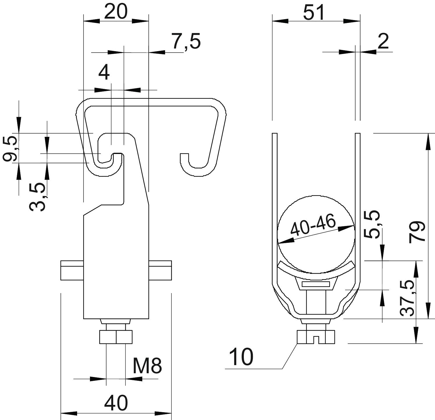 bez halogena da Broj kablova/cevi 1 CO2 otisak (GWP) od kolevke do kapije 0,1701 kg CO₂e / 1 Komad Dimenzija 40-46mm Dimenzija A 20 mm Dimenzija B 51 mm Dimenzija C 40 mm Dimenzija G (mm) M8 Dimenzija H 79 mm Dimenzija L 37,5 mm Dimenzija t 2 mm Dimenzija x 5,5 mm Dodatak materijal Čelik Dodatak površina toplo pocinkovano Kvalitet materijala korita Polipropilen Maks. Zatezni momenat 5 Nm Materijal Čelik Materijal korita Plastika Način montaže Profilna šina Otporno na udarce ne Površina vruće pocinkano utapanjem Sa kontrakoritom ne Sa metalnim koritom ne Sa plastičnim koritom da za 1 kabla D 37,5 za 1 kabla V 79 mm za 2 kabla H 128 mm za 2 kabla L 44,5 mm za 3 kabla D 56,5 mm za 3 kabla V 177 mm za prečnik cevi maks. 40 mm za prečnik cevi min. 40 mm za šine širine proreza (sa intervalom) maks. 22 mm za šine širine proreza (sa intervalom) min. 18 mm Zatezna oblast D maks. 46 mm Zatezna oblast D min. 40 mm - Svi tipovi