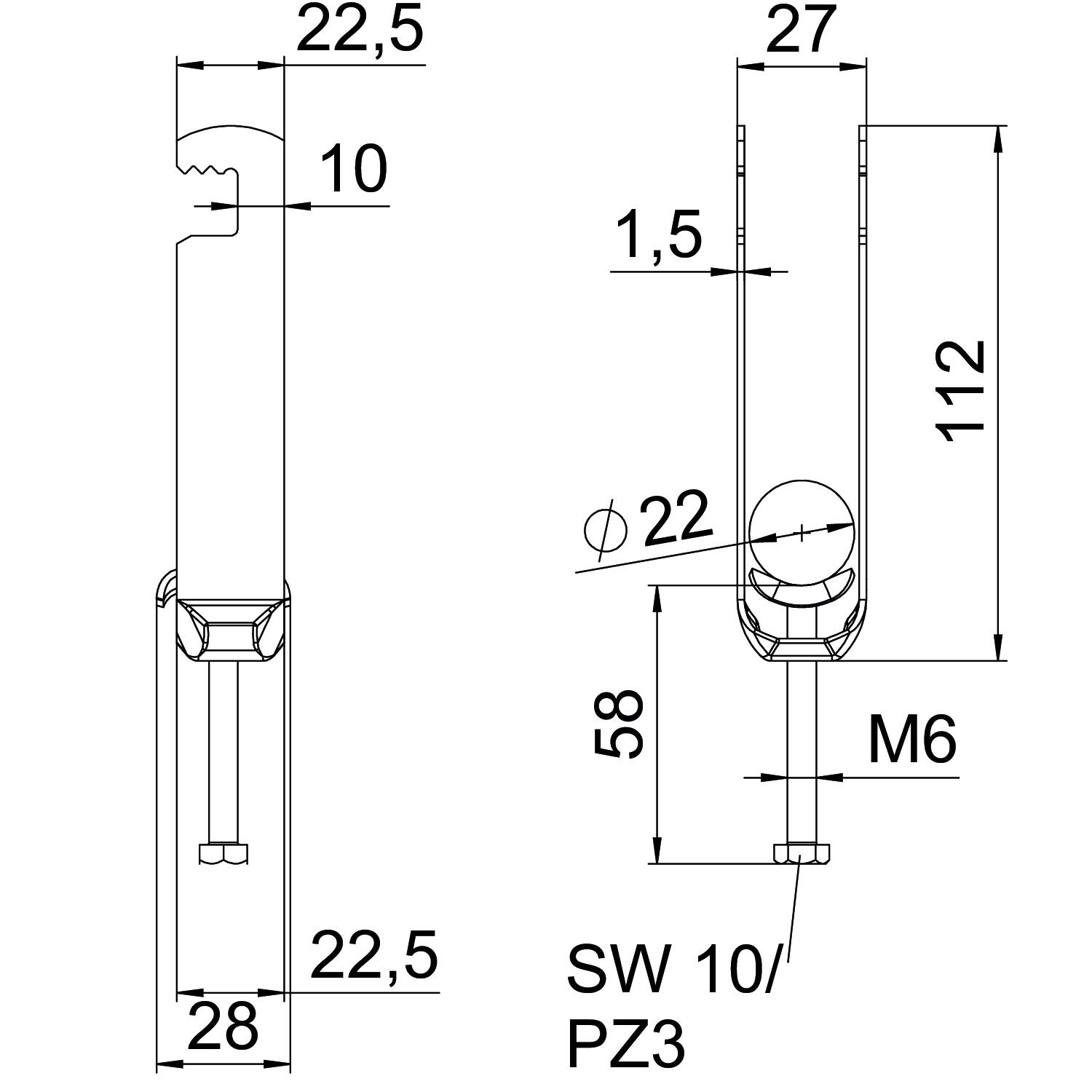 bez halogena da Broj kablova/cevi 3 CO2 otisak (GWP) od kolevke do kapije 0,2219 kg CO2e / 1 Komad Debljina lima 1,5 mm Dimenzija 16-22mm Dimenzija A 22,5 mm Dimenzija B 27 mm Dimenzija C 28 mm Dimenzija G (mm) M6 Dimenzija H 112 mm Dimenzija L 58 mm Dimenzija t 1,5 mm Dodatak materijal Čelik Dodatak površina toplo pocinkovano Dužina 22,5 mm Dužina spoljne dimenzije 28 mm Maks. Zatezni momenat 3 Nm Materijal Čelik Način montaže ravan profil Navoj M6 Površina vruće pocinkano utapanjem Sa metalnim koritom da Širina 27 mm Širina proreza 10 mm Visina 112 mm za prečnik cevi maks. 22 mm za prečnik cevi min. 16 mm Zatezna oblast D maks. 22 mm Zatezna oblast D min. 16 mm - Svi tipovi