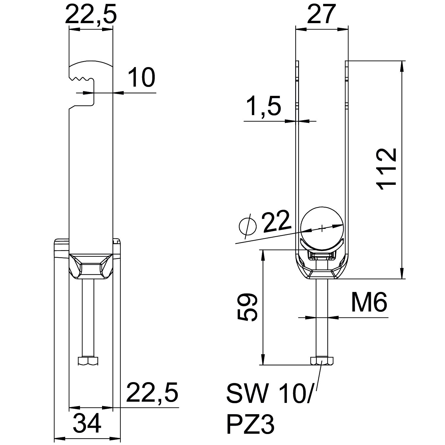 bez halogena da Broj kablova/cevi 3 CO2 otisak (GWP) od kolevke do kapije 0,2081 kg CO2e / 1 Komad Debljina lima 1,5 mm Dimenzija 16-22mm Dimenzija A 22,5 mm Dimenzija B 27 mm Dimenzija C 34 mm Dimenzija G (mm) M6 Dimenzija H 112 mm Dimenzija L 59 mm Dimenzija t 1,5 mm Dodatak materijal Čelik Dodatak površina toplo pocinkovano Dužina 22,5 mm Dužina spoljne dimenzije 34 mm Maks. Zatezni momenat 3 Nm Materijal Čelik Način montaže ravan profil Navoj M6 Površina vruće pocinkano utapanjem Sa plastičnim koritom da Širina 27 mm Širina proreza 10 mm Visina 112 mm za prečnik cevi maks. 22 mm za prečnik cevi min. 16 mm Zatezna oblast D maks. 22 mm Zatezna oblast D min. 16 mm - Svi tipovi