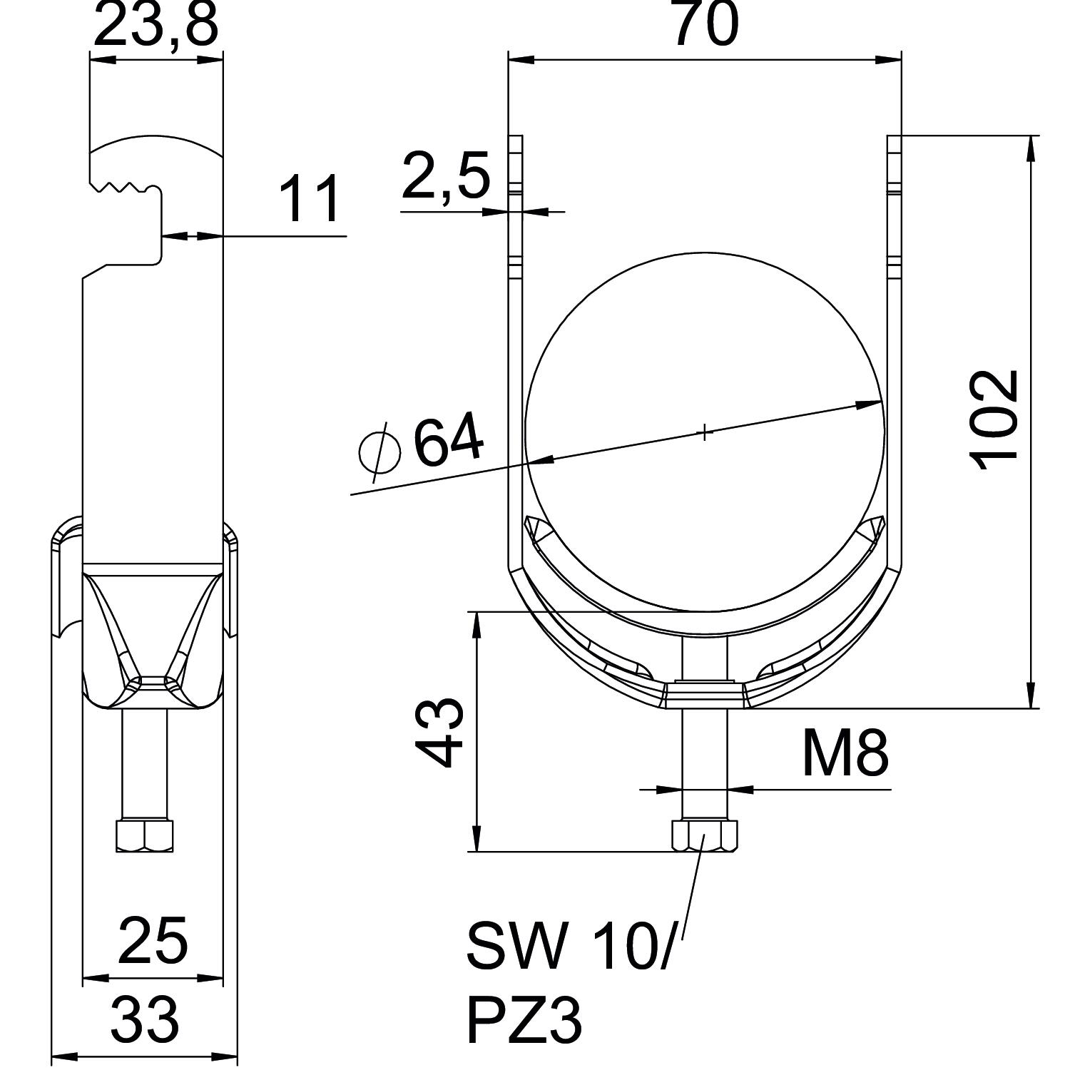 bez halogena da Broj kablova/cevi 1 CO2 otisak (GWP) od kolevke do kapije 0,3554 kg CO2e / 1 Komad Debljina lima 2,5 mm Dimenzija 58-64mm Dimenzija A 25 mm Dimenzija B 70 mm Dimenzija C 33 mm Dimenzija G (mm) M8 Dimenzija H 102 mm Dimenzija L 43 mm Dimenzija t 2,5 mm Dodatak materijal Čelik Dodatak površina toplo pocinkovano Dužina 25 mm Dužina spoljne dimenzije 33 mm Maks. Zatezni momenat 5 Nm Materijal Čelik Materijal korita Čelik Način montaže ravan profil Navoj M8 Površina vruće pocinkano utapanjem Sa kontrakoritom ne Sa metalnim koritom da Širina 70 mm Širina proreza 10 mm Visina 102 mm za prečnik cevi maks. 64 mm za prečnik cevi min. 58 mm Zatezna oblast D maks. 64 mm Zatezna oblast D min. 58 mm - Svi tipovi