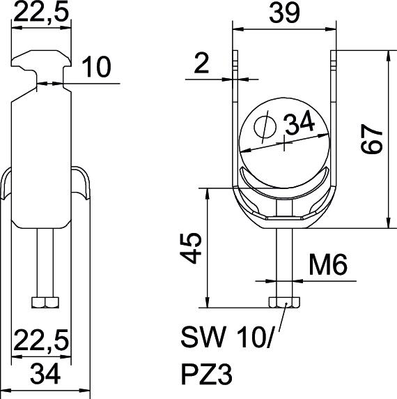 Opis proizvodaLučna obujmica sa čekićastom stopom, metalno pritisno korito sa zaobljenim ivicama radi zaštite kabla. Za vertikalnu i horizontalnu montažu jednog pojedinačnog kabla na C-šinu Za širinu proreza 16 - 17 mm. Pomoću zavrtnja sa 1-strukim navojem pričvrstiti na pritisno korito, univerzalna šestostrana glava zavrtnja SW10, sa ravnim ili krstastim prorezom. Pogodno za montažu u zatvorenom i na otvorenom prostoru. Suprotno korito se mora naručiti posebno.