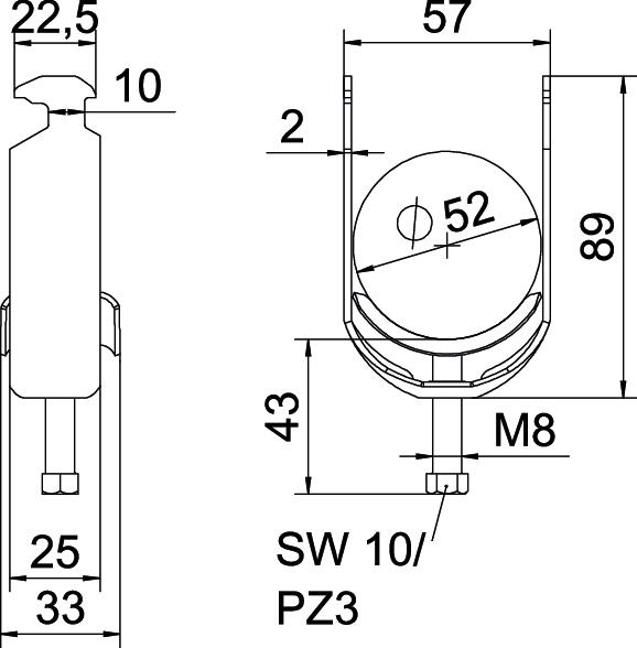 Opis proizvodaLučna obujmica sa čekićastom stopom, metalno pritisno korito sa zaobljenim ivicama radi zaštite kabla. Za vertikalnu i horizontalnu montažu jednog pojedinačnog kabla na C-šinu Za širinu proreza 16 - 17 mm. Pomoću zavrtnja sa 1-strukim navojem pričvrstiti na pritisno korito, univerzalna šestostrana glava zavrtnja SW10, sa ravnim ili krstastim prorezom. Pogodno za montažu u zatvorenom i na otvorenom prostoru. Suprotno korito se mora naručiti posebno.