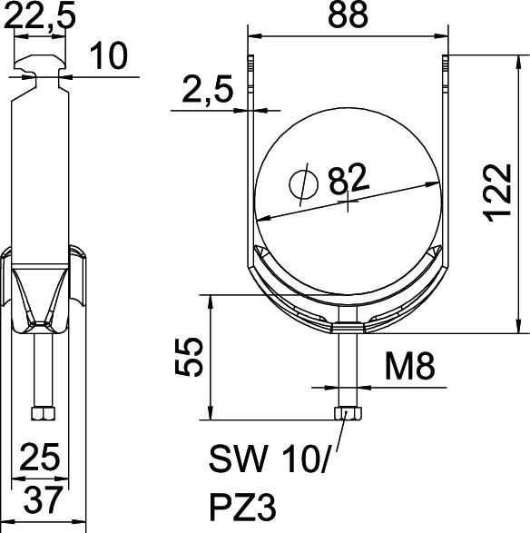 Opis proizvodaLučna obujmica sa čekićastom stopom, metalno pritisno korito sa zaobljenim ivicama radi zaštite kabla. Za vertikalnu i horizontalnu montažu jednog pojedinačnog kabla na C-šinu Za širinu proreza 16 - 17 mm. Pomoću zavrtnja sa 1-strukim navojem pričvrstiti na pritisno korito, univerzalna šestostrana glava zavrtnja SW10, sa ravnim ili krstastim prorezom. Pogodno za montažu u zatvorenom i na otvorenom prostoru. Suprotno korito se mora naručiti posebno.