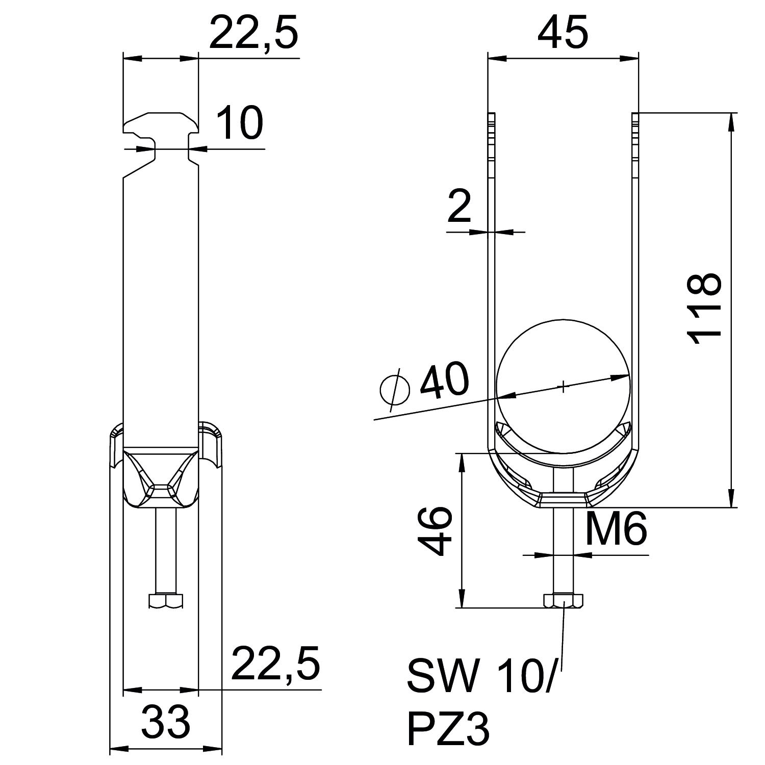 Opis proizvodaLučna obujmica sa čekićastom stopom, metalno pritisno korito sa zaobljenim ivicama radi zaštite kabla. Za vertikalnu i horizontalnu montažu 2 pojedinačna kabla na C-profilnu šinu. Za širinu proreza 16 - 17 mm. Pomoću zavrtnja sa 1-strukim navojem pričvrstiti na pritisno korito, univerzalna šestostrana glava zavrtnja SW10, sa ravnim ili krstastim prorezom. Pogodno za montažu u zatvorenom i na otvorenom prostoru. Više kablova treba odvojiti dvostrukim koritom. Preporučuje se upotreba kontrakadice